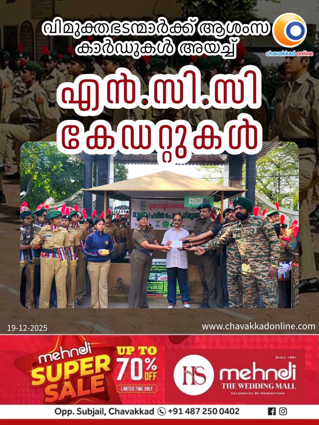 ഇൻഡ്യൻ നേവിയിലെ ലഫ്റ്റനൻ്റ് കമാണ്ടറും പരീശിലനത്തിനിടയിൽ വീരമൃത്യു വരിച്ച ഗുരുവായൂർ സ്വദേശി വിബിൻ ദേവിൻ്റെ പിതാവ് വിജയ്കുമാറിന് ആദ്യ കാർഡ് മേജർ സമ്മാനിച്ചു. 7 കേരള ഗേൾസ് ബറ്റാലിയനിലെ ലഫ്റ്റനൻ്റ് മിനി.ടി.ജെ അധ്യക്ഷത വഹിച്ച യോഗത്തിൽ സൈനികരായ സുബേദാർ ശശി’ രജ്ജിത്ത്, ഗുർബജ് സിംഗ് എന്നിവർ പ്രസംഗിച്ചു. മകൻ്റെ വേർപാടിൽ ദുഃഖമുണ്ടെങ്കിലും ഭാവി സൈനികരായ എൻ.സി.സി കേഡറ്റുകളിലുടെ ഞാൻ അവനെ കാണുന്നുണ്ടെന്ന് മറുപടി പ്രസംഗത്തിൽ വിജയ് കുമാർ പറഞ്ഞു. ഗുരുവായൂർ എൽ.എഫ് കോളജിലെ സീനിയർ അണ്ടർ ഓഫീസർ ലക്ഷ്മി പ്രിയ പദ്ധതി വിശദീകരണം നടത്തി. മമ്മിയൂർ എൽ.എഫ് കോളേജ്’ ‘ഗുരുവായൂർ ശ്രീകൃഷ്ണ കോളേജ്’ കുന്നംകുളം ഗവൺമെൻ് പോളിടെക്നിക് എന്നിവിടങ്ങളിലെ എൻ.സി.സി കേഡറ്റുകളാണ് പരിപാടിയിൽ പങ്കെടുത്തത്.