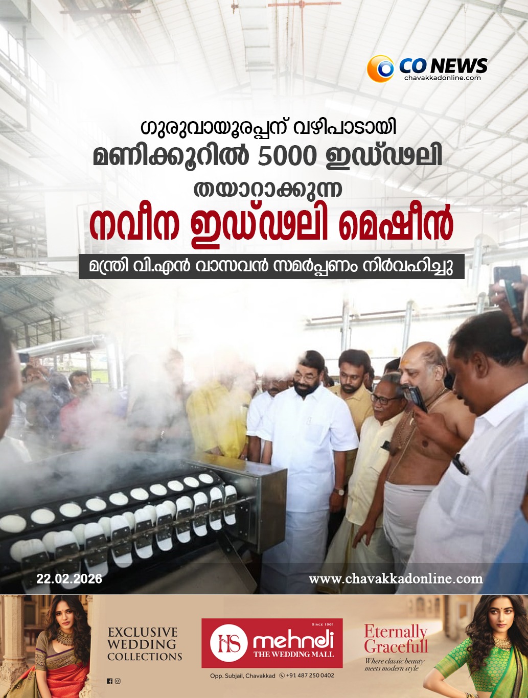 ഗുരുവായൂർ : മണിക്കൂറിൽ അയ്യായിരം ഇഡ്ഢലി തയ്യാറാക്കാനാകുന്ന നവീന ഇഡ്ഢലി മെഷീൻ ഗുരുവായൂർ ക്ഷേത്രത്തിലേക്ക് സമർപ്പണം ചെയ്തു. ദേവസ്വം മന്ത്രി വി എൻ വാസവൻ ഇഡ്ഢലി മെഷീൻ ഭക്തർക്കായി സമർപ്പിച്ചു. ക്ഷേത്രം അന്ന ലക്ഷ്മി ഹാളിലായിരുന്നു ചടങ്ങ്. കാനഡയിൽ ഹോട്ടൽ വ്യവസായിയായ ബാലസുബ്രഹ്മണ്യമാണ് ഈ വഴിപാട് സമർപ്പണം നടത്തിയത്. ദേവസ്വം ചെയർമാൻ ഡോ. വി.കെ.വിജയൻ, ഭരണസമിതി അംഗങ്ങളായ ബ്രഹ്മശ്രീ.മല്ലിശ്ശേരി പരമേശ്വരൻ നമ്പൂതിരിപ്പാട്, സി. മനോജ്, കെ .പി.വിശ്വനാഥൻ, മനോജ് ബി നായർ, അഡ്മിനിസ്ട്രേറ്റർ ഒ.ബി. അരുൺകുമാർ എന്നിവർ സന്നിഹിതരായി