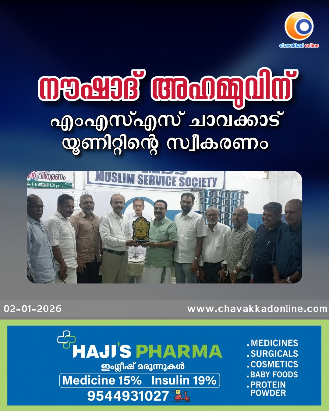 ചാവക്കാട് : ഗുരുവായൂർ നഗരസഭ കൗൺസിലറായി തെരഞ്ഞെടുത്ത മുൻ എം.എസ്.എസ് യൂണിറ്റ് സെക്രട്ടറി നൗഷാദ് അഹമ്മുവിന് എം.എസ്.എസ് ചാവക്കാട് യൂണിറ്റ് കമ്മറ്റിയുടെ നേതൃത്വത്തിൽ സ്വീകരണം നൽകി. എം. എസ്. എസ് സംസ്ഥാന വൈ: പ്രസിഡണ്ട് ടി.എസ്. നിസാമുദ്ദീൻ ഉപഹാരം നൽകി ആദരിച്ചു. പ്രസിഡണ്ട് നൗഷാദ് തെക്കുംപുറം അധ്യക്ഷത വഹിച്ചു.