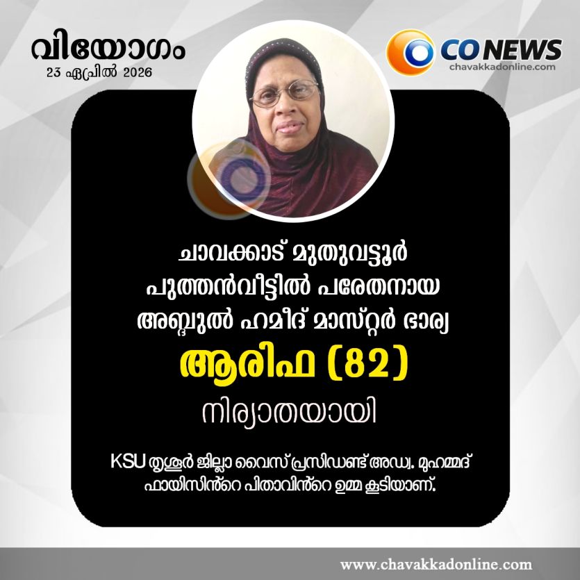 ചാവക്കാട്: മുതുവട്ടൂർ ജംഗ്ഷനിൽ താമസിക്കുന്ന പുത്തൻവീട്ടിൽ പരേതനായ അബ്ദുൽ ഹമീദ് മാസ്റ്റർ ഭാര്യ ആരിഫ ( 82 ) നിര്യാതയായി.കബറടക്കം ഇന്ന് ( വ്യാഴം ) വൈകീട്ട് 4 മണിക്ക്* മണത്തല പള്ളി കബർസ്ഥാനിൽ നടന്നു.മക്കൾ: നൗഷാദ് ( പുതുമ ), പരേതയായ നസീം. മരുമക്കൾ: ബുഷറ, ഹസ്സൻ.