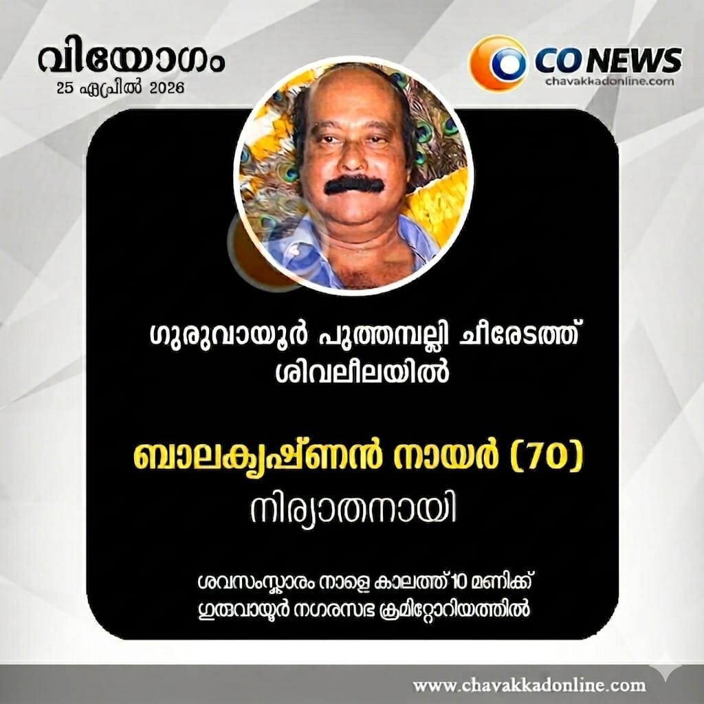 Obituary വിയോഗം By From the desk Last updated Apr 25, 2026 Share ഗുരുവായൂർ പുത്തമ്പല്ലി ചീരേടത്ത് ശിവലീലയിൽ ( MRA No. 84) ബാലകൃഷ്ണൻ നായർ (70 ) നിര്യാതനായി. ഭാര്യ : ജയലക്ഷ്മി. മക്കൾ : ശ്രീകാന്ത് (ഹൈദരാബാദ് ), ശ്രീജിത്ത് ( ദുബായ് ). ശവസംസ്കാരം ഞായറാഴ്ച കാലത്ത് 10 മണിക്ക് ഗുരുവായൂർ നഗരസഭ ക്രമിറ്റോറിയത്തിൽ. DeathGURUVAYURKottapadiObitObituary Share FacebookTwitterGoogle+ReddItWhatsAppPinterestEmail
