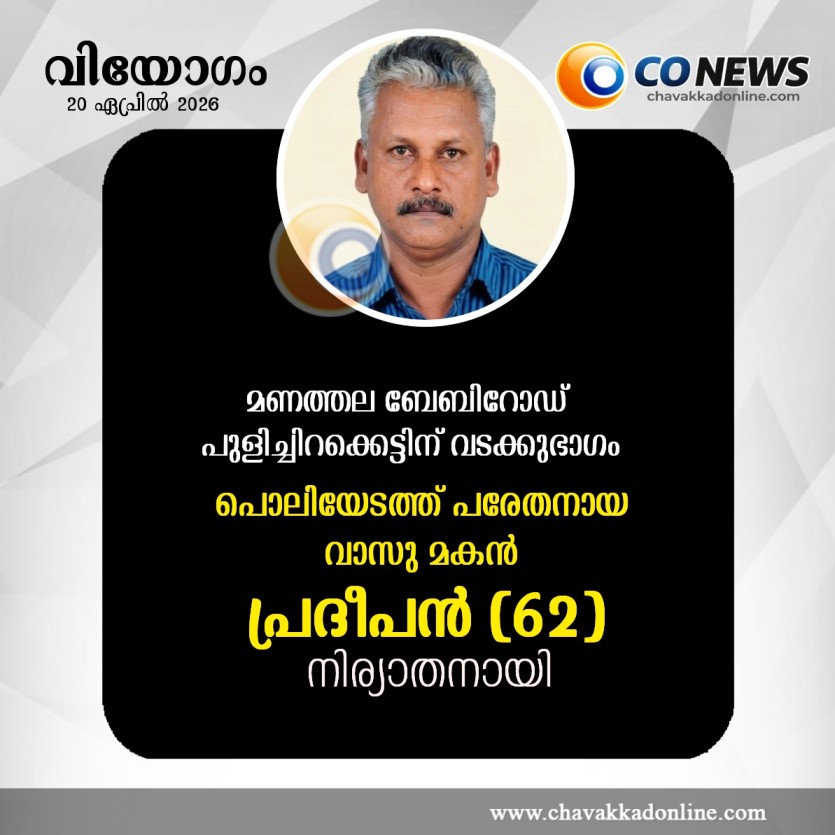 ചാവക്കാട്: മണത്തല ബേബിറോഡ് പുളിച്ചിറക്കെട്ടിന് വടക്കുഭാഗം താമസിക്കുന്ന പൊലിയേടത്ത് പരേതനായ വാസു മകൻ പ്രദീപൻ (62) നിര്യാതനായി. ഭാര്യ:ഉഷ. മക്കൾ: പ്രതീക്ഷ, പ്രജീഷ്. മരുമകൻ: വിനോദ്. സംസ്കാരം ചൊവ്വാഴ്ച്ച കാലത്ത് 11.30ന് ചാവക്കാട് നഗരസഭ വാതക ശ്മശാനത്തിൽ.