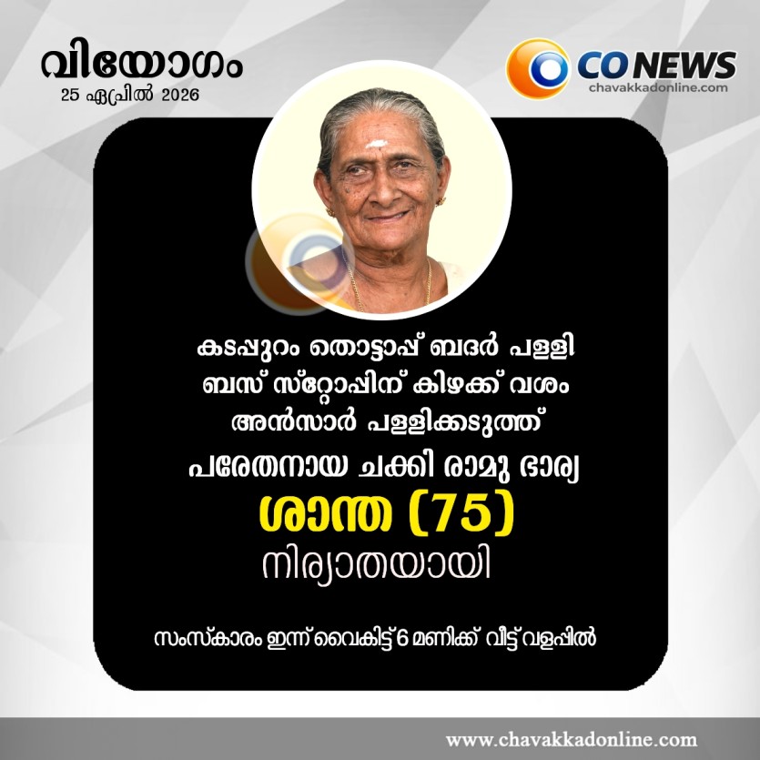 കടപ്പുറം: മുൻപ് ആനന്ദവാടിയിൽ താമസിച്ചിരുന്ന ഇപ്പോൾ തൊട്ടാപ്പ് ബദർ പള്ളി ബസ് സ്റ്റോപ്പിന് കിഴക്ക് വശം അൻസാർ പള്ളിക്കടുത്ത് താമസിക്കുന്ന പരേതനായ ചക്കി രാമു ഭാര്യ ശാന്ത (75) നിര്യാതയായി. മക്കൾ: സുകുമാരൻ ( സി.പി.ഐ. എം . ലോക്കൽ കമ്മറ്റി അംഗം ) സധു, സതീഷ്, ഹേമലത, സജീല,സുമ, സിന്ദു. മരുമക്കൾ: മിനി, സിന്ദു, ഗാർഗി, ശ്രീരാമൻ, തിലകൻ, നാരായണൻ. പരേതനായ ഉണ്ണികൃഷ്‌ണൻ. സംസ്‌കാരം ഇന്ന് വൈകിട്ട് ( 25.04. 2026 ശനിയാഴ്ച ) 6 മണിക്ക് വീട്ട് വളപ്പിൽ.