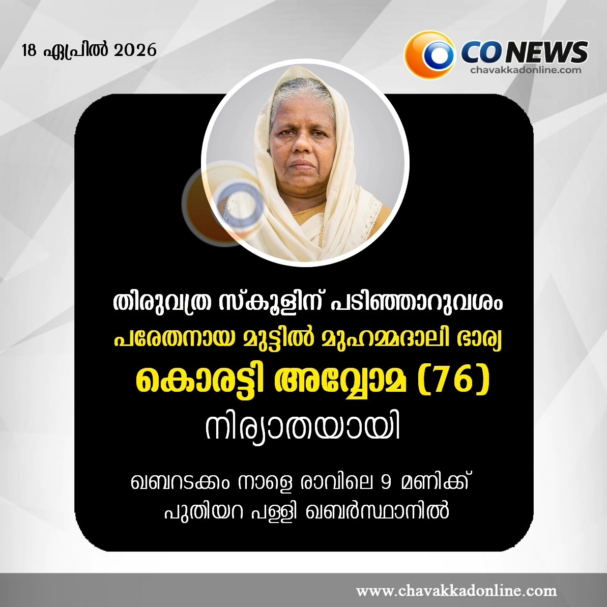 Obituary വിയോഗം By From the desk Last updated Apr 18, 2026 Share തിരുവത്ര സ്കൂളിന് പടിഞ്ഞാറുവശം താമസിക്കുന്ന പരേതനായ മുട്ടിൽ മുഹമ്മദാലി ഭാര്യ കൊരട്ടി അവ്വോമ (76) നിര്യാതയായി. മകൻ അബ്ദുൽ ജലീൽ. മരുമകൾ ഷമീജ. ഖബറടക്കം നാളെ രാവിലെ 9 മണിക്ക് പുതിയറ പള്ളി ഖബർസ്ഥാനിൽ. ChavakkadDeathObituaryThiruvathra Share FacebookTwitterGoogle+ReddItWhatsAppPinterestEmail