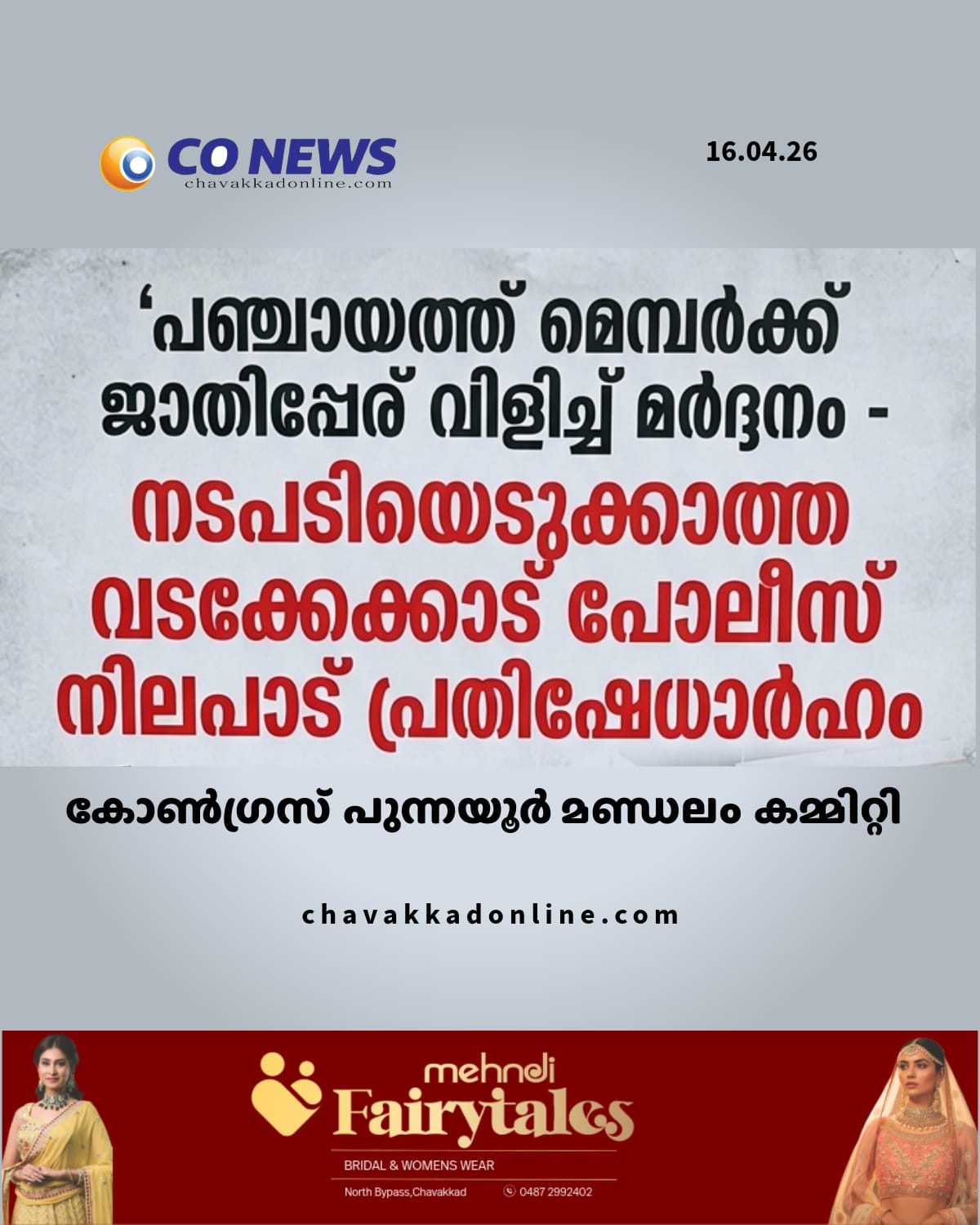 പഞ്ചായത്ത്‌ മെമ്പർക്ക് ജാതിപ്പേര് വിളിച്ച് മർദ്ദനം – നടപടിയെടുക്കാത്ത വടക്കേക്കാട് പോലീസ് നിലപാട് പ്രതിഷേധാർഹം