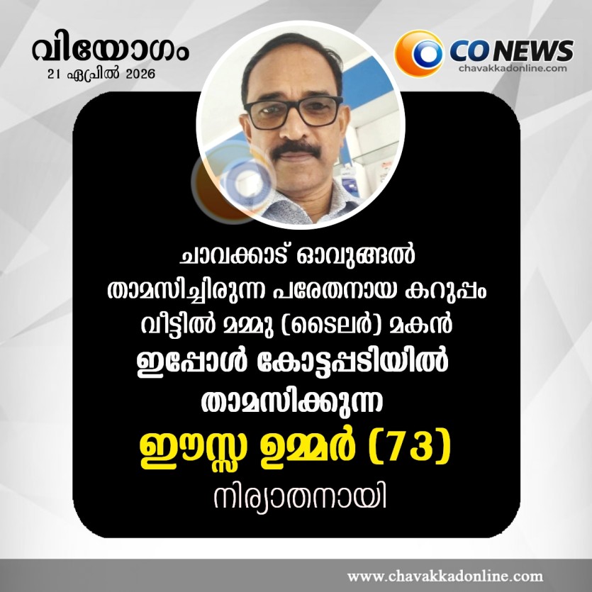 General വേർപാട് By From the desk Last updated Apr 21, 2026 Share ചാവക്കാട്: ഓവുങ്ങൽ താമസിച്ചിരുന്ന, പരേതനായ കറുപ്പം വീട്ടിൽ മമ്മു (ടൈലർ) മകൻ ഇപ്പോൾ കോട്ടപ്പടിയിൽ താമസിക്കുന്ന ഈസ്സ ഉമ്മർ (73) നിര്യാതനായി.ഭാര്യ: റംല. മക്കൾ: സുഹൈൽ, നിലോഫർ. മരുമക്കൾ: അജ്മൽ, ഹന. ChavakkadOvigal Share FacebookTwitterGoogle+ReddItWhatsAppPinterestEmail