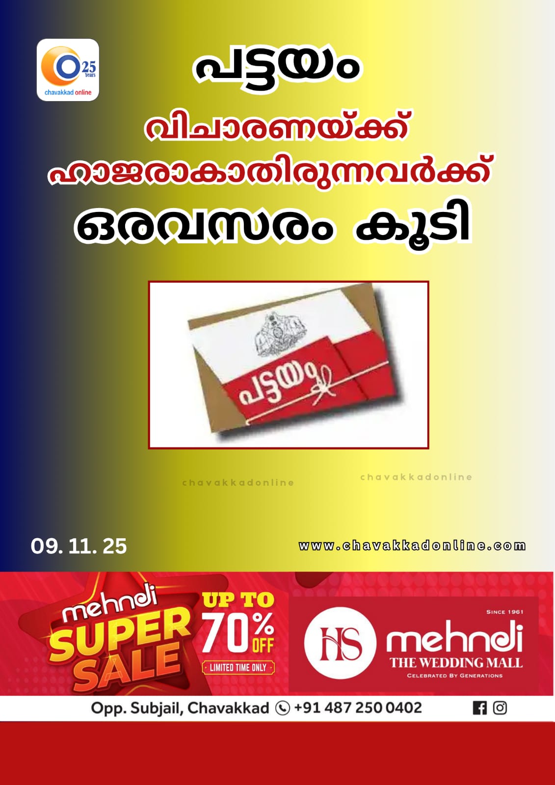 ചാവക്കാട് : ലാൻഡ് ട്രൈബ്യൂണലുകളിലെ കേസ് ഫയൽ തീർപ്പാക്കൽ കർമ്മ പദ്ധതിയുടെ ഭാഗമായി, കുന്നംകുളം ലാൻഡ് ട്രൈബ്യൂണൽ ഓഫീസിൽ 31.12.2024 വരെ ക്രയ സർട്ടിഫിക്കറ്റ് ലഭിക്കുന്നതിനായി അപേക്ഷ നൽകിയ തലപ്പിള്ളി, കുന്നംകുളം, ചാവക്കാട് താലൂക്ക് പരിധിയിൽ പെട്ട അപേക്ഷകരിൽ, വിചാരണയ്ക്ക് ഹാജരാകാതിരുന്നവർക്ക് ഒരു അവസരം കൂടി നൽകുന്നു. 10.11.2025, 11.11.2025, 12.11.2025 എന്നീ തീയതികളിൽ ഏതെങ്കിലും ദിവസം രാവിലെ 10.30 ന് കുന്നംകുളം ലാൻഡ് ട്രൈബ്യൂണൽ ഓഫീസിൽ കൈപ്പറ്റു രശീതി സഹിതം വിചാരണയ്ക്ക് ഹാജരാകേണ്ടതാണ്. ഹാജരാകാത്ത അപേക്ഷകരുടെ കേസുകൾ ഇനി ഒരറിയിപ്പില്ലാതെ തീർപ്പാക്കുന്നതായിരിക്കും എന്ന് ലാൻഡ് ട്രൈബ്യൂണൽ സ്പെഷ്യൽ തഹസിൽദാർ ബാബു കെ ടി അറിയിച്ചു