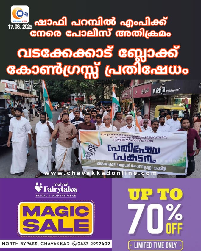 പുന്നയൂർക്കുളം: പേരാമ്പ്രയിൽ ഷാഫി പറമ്പിൽ എംപിക്ക് നേരെ പോലീസ് നടത്തിയ അതിക്രമത്തിൽ പ്രതിഷേധിച്ച് വടക്കേക്കാട് ബ്ലോക്ക് കോൺഗ്രസ് കമ്മിറ്റി പ്രകടനം നടത്തി. വടക്കേക്കാട് എം ആന്റ് ടി ഹാൾ പരിസരത്ത് നിന്നും ആരംഭിച്ച പ്രതിഷേധ പ്രകടനം ആൽത്തറ സെന്ററിൽ സമാപിച്ചു. തുടർന്ന് നടന്ന പ്രതിഷേധ യോഗം ഡിസിസി ജനറൽ സെക്രട്ടറി എ. എം. അലാവുദ്ധീൻ ഉദ്ഘാടനം ചെയ്തു. ബ്ലോക്ക് കോൺഗ്രസ് പ്രസിഡന്റ് വി. കെ. ഫസലുൽഅലി അധ്യക്ഷത വഹിച്ചു.