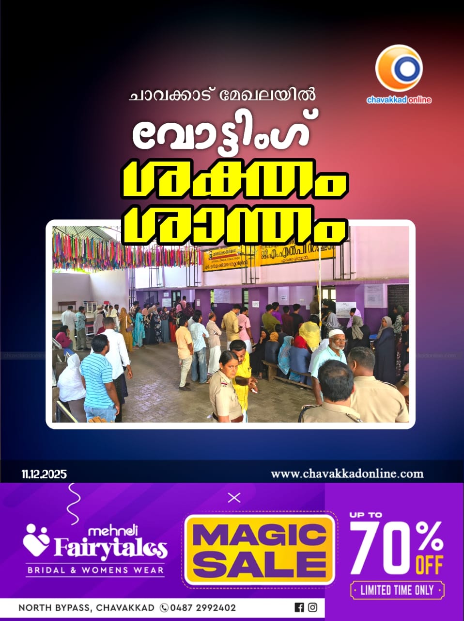 ചാവക്കാട് : ചാവക്കാട് മേഖലയിൽ പോളിംഗ് ശാന്തം. പുന്നയൂർക്കുളം, വടക്കേകാട്, പുന്നയൂർ, ഒരുമനയൂർ, കടപ്പുറം, എങ്ങണ്ടിയൂർ തുടങ്ങിയ പഞ്ചായത്തുകളിലും ചാവക്കാട്, ഗുരുവായൂർ നഗരസഭകളിലും 70 ശതമാനത്തിന് മുകളിൽ വോട്ട് രേഖപ്പെടുത്തി. വോട്ടിംഗ് ആരംഭിക്കുന്നതിനു മുന്നേ തന്നെ പല ബൂത്തുകളിലും നീണ്ട നിര രൂപപ്പെട്ടു കഴിഞ്ഞിരുന്നു. 60 ശതമാനത്തിനു താഴെ വോട്ട് രേഖപ്പെടുത്തിയ ചില വാർഡുകളും കടപ്പുറം പഞ്ചായത്തിലുണ്ട്. അനിഷ്ട സംഭവങ്ങളൊന്നും റിപ്പോർട്ട് ചെയ്തിട്ടില്ല.