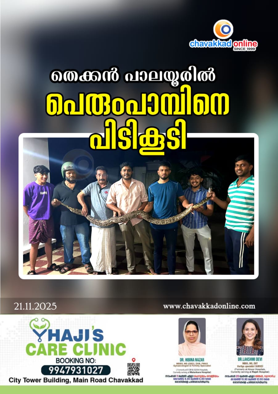 യു ഡി എഫ് പതിമൂന്നാം വാർഡ് സ്ഥാനാർഥിയായ ആരിഫ് പാലയൂർ, ഗുരുവായൂർ ബ്ലോക്ക് സെക്രട്ടറി അനീഷ് പാലയൂർ, അൻസിൽ കെ എസ്, റഫീഖ് ചിക്കിങ്, സിയാൻ മാളിയേക്കൽ, ഷെരീഫ് എ എച്ച്, ജനീഷ് സി എം, മുഹമ്മദ് ഹിസാൻ എന്നിവരുടെ നേതൃത്വത്തിലാണ് പാമ്പിനെ പിടികൂടിയത്. പിടികൂടിയ പെരുമ്പാമ്പിനെ ഇന്നലെ രാത്രി തന്നെ എരുമപ്പെട്ടി ഫോറെസ്റ്റ് ഓഫീസിൽ നേരിട്ട് കൈമാറി.