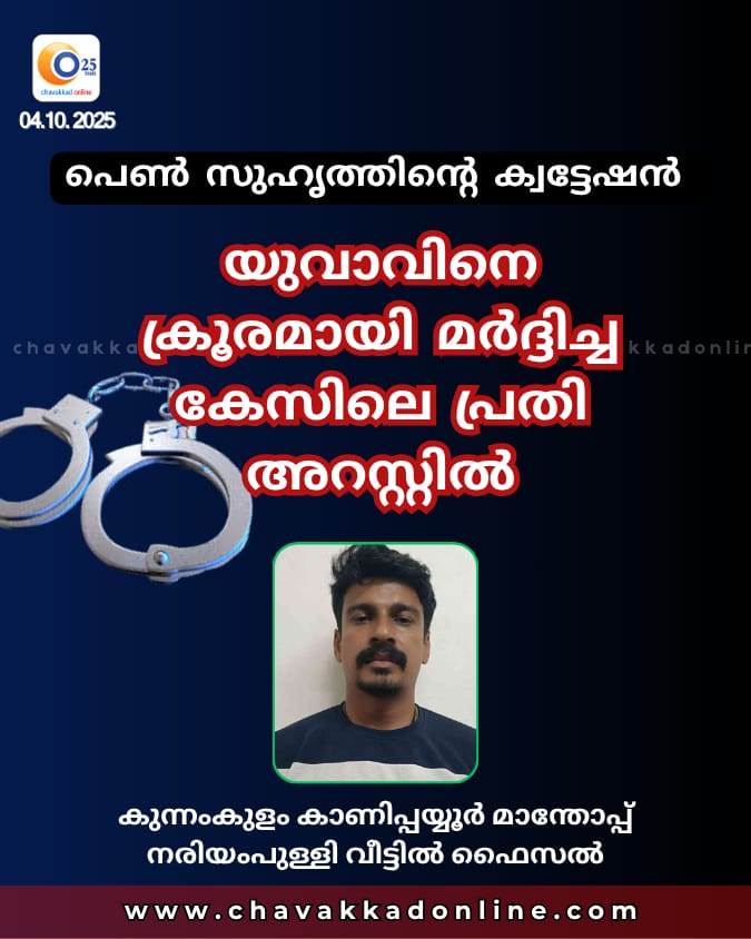 പുന്നയൂർക്കുളം: പെൺ സുഹൃത്തിന്റെ ക്വട്ടേഷനിൽ യുവാവിനെ ക്രൂരമായി മർദ്ദിച്ച സംഭവത്തിൽ ഒളിവിൽ കഴിഞ്ഞ പ്രതിയെ വടക്കേക്കാട് പോലീസ് അറസ്റ്റ് ചെയ്തു. കുന്നംകുളം കാണിപ്പയ്യൂർ മാന്തോപ്പ് നരിയംപുള്ളി വീട്ടിൽ ഫൈസലി(35)നെയാണ് വടക്കേക്കാട് ഇൻസ്പെക്ടർ എം.കെ. രമേശിന്റെ നേതൃത്വത്തിലുള്ള പോലീസ് സംഘം അറസ്റ്റ് ചെയ്തത്.