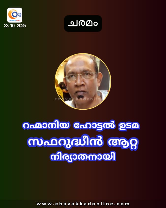 ചാവക്കാട്: റഹ്മാനിയ ഹോട്ടൽ ഉടമ പരേതനായ മുഹമ്മദുണ്ണി മകൻ, (പാലുവായ്, മാമാബസാറിൽ താമസിക്കുന്ന) സഫറുദ്ധീൻ ആറ്റ (65) നിര്യാതനായി. ഹൃദായാഘാതത്തെ തുടർന്ന് തൃശൂരിലെ സ്വകാര്യ ആശുപത്രിയിൽ ചികിത്സയിൽ ഇരിക്കെ ഇന്ന് രാവിലെയായിരുന്നു മരണം. ഭാര്യ: ഷെമി. മക്കൾ: സുഹാന, അമൻ. സഹോദരങ്ങൾ: അഷറഫ്, പരേതരായ അബ്ദുൽ കലാം, സിയാഉദ്ധീൻ, കബീർ. ഖബറടക്കം മണത്തല പള്ളി കബർസ്ഥാനിൽ.