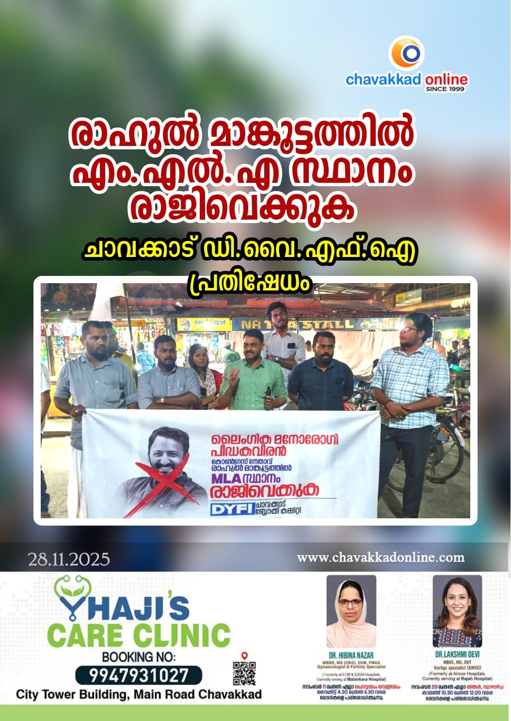 ചാവക്കാട് : ഹുൽ മാങ്കൂട്ടത്തിൽ ലൈംഗിക മനോരോഗിയെന്നും എംഎൽഎ സ്ഥാനം രാജിവെക്കണമെന്നും ആവശ്യപ്പെട്ട് ഡി വൈ എഫ് ഐ ചാവക്കാട് ബ്ലോക്ക് കമ്മിറ്റിയുടെ നേതൃത്വത്തിൽ പ്രതിഷേധ പ്രകടനം നടത്തി.