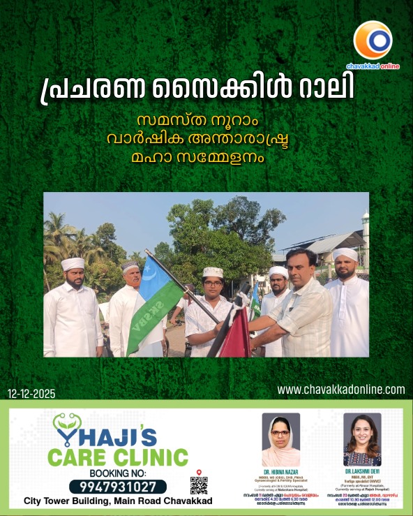 വടക്കേക്കാട് : സമസ്ത നൂറാം വാർഷിക അന്താരാഷ്ട്ര മഹാസമ്മേളനത്തിൻ്റെ പ്രചരണാർത്ഥം വടക്കേകാട് റെയ്ഞ്ച് എസ് ബി വി ( സുന്നി ബാല വേദി ) സൈക്കിൾ റാലി സംഘടിപ്പിച്ചു. എസ് ബി വി ചെയർമാൻ ശാകിർ ഫൈസി, കൺവീനർ സ്വാദിഖ് അൻവരി എന്നിവർ നേതൃത്വം നൽകി. റെയ്ഞ്ച് മാനേജ്മെൻറ് സെക്രട്ടറി അബ്ദുൽ ഗഫൂർ ചമ്മന്നൂർ ഫ്ലാഗ് ഓഫ് നിർവ്വഹിച്ചു.