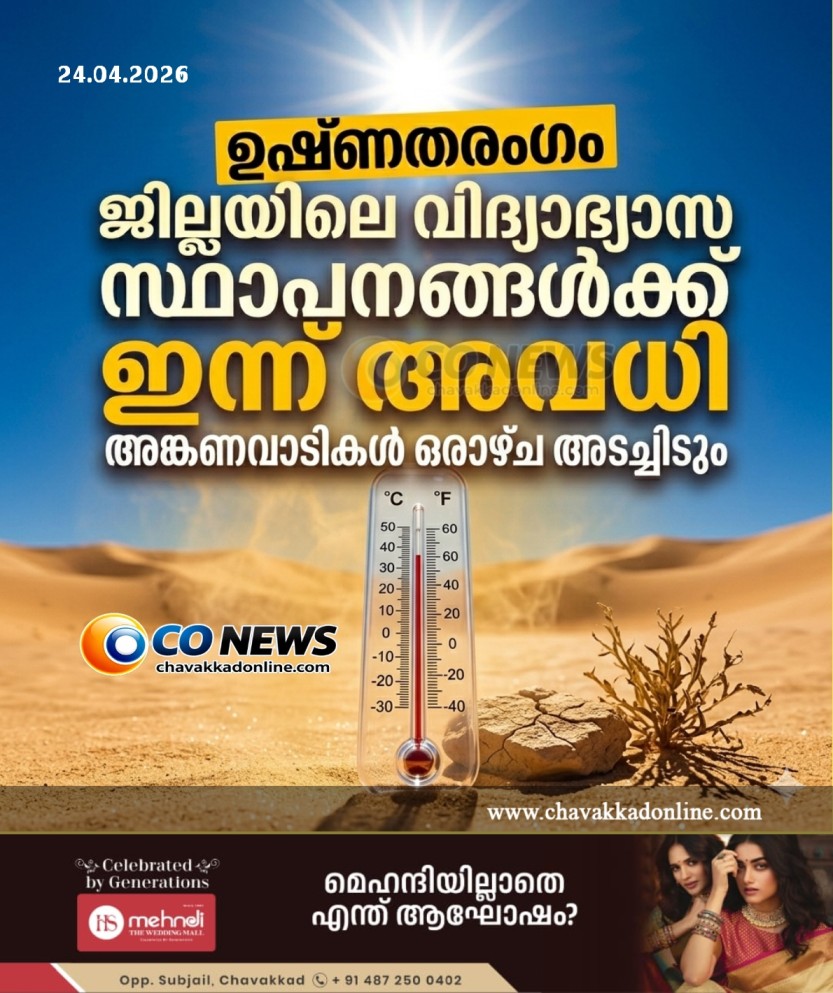 കഠിനമായ ഉഷ്ണതരംഗം: തൃശൂർ ജില്ലയിലെ വിദ്യാഭ്യാസ സ്ഥാപനങ്ങൾക്ക് ഇന്ന് അവധി