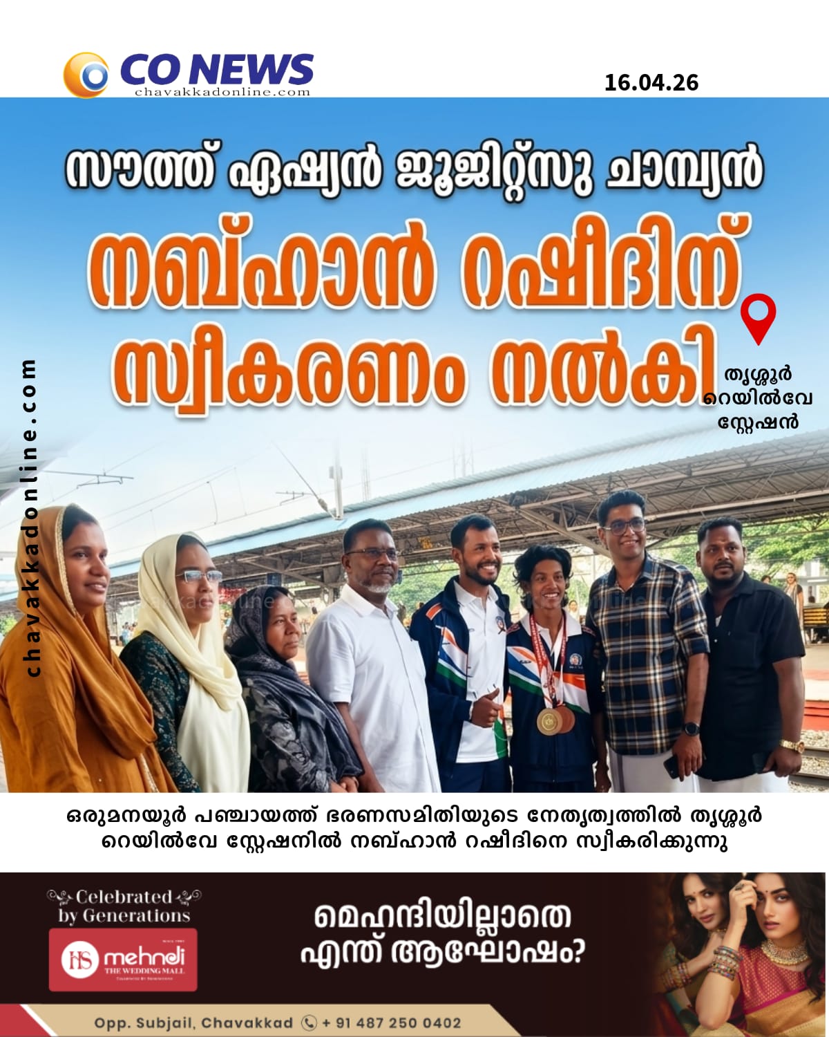 ചാവക്കാട്: ശ്രീലങ്കയിൽ വെച്ച് നടന്ന സൗത്ത് ഏഷ്യൻ ജൂജിറ്റ്സു ചാമ്പ്യൻഷിപ്പ് വിഭാഗത്തിൽ ഇന്ത്യക്ക് വേണ്ടി സ്വർണ്ണ മെഡലും, ഫൈറ്റ് വിഭാഗത്തിൽ വെങ്കല മെഡലും കരസ്ഥമാക്കിയ ഒരുമനയൂർ സ്വദേശി നബ്ഹാൻ റഷീദിന് റെയിൽവേ സ്റ്റേഷനിൽ ഒരുമനയൂർ പഞ്ചായത്ത് ഭരണസമിതി സ്വീകരണം നൽകി. ഒരുമനയൂർ പഞ്ചായത്ത് പ്രസിഡന്റ് പി എം താഹിറിന്റെ നേതൃത്വത്തിൽ തൃശൂർ റെയിൽവേസ്റ്റേഷനിൽ നൽകിയ സ്വീകരണത്തിൽ പഞ്ചായത്ത് വൈസ് പ്രസിഡന്റ് നഷറ മുഹമ്മദ്, വികസന സ്റ്റാന്റിംഗ് കമ്മിറ്റി ചെർപേഴ്സൺ ഷക്കീർ രായമ്മരക്കാർ, ക്ഷേമകാര്യ സ്റ്റാന്റിംഗ് കമ്മിറ്റി ചെയർപേഴ്സൺ ഹഫ്സത്ത് അഷ്റഫ്, മെമ്പർമാരായ ആരിഫ ജൂഫൈർ, ധനേഷ് വി സി എന്നിവരും, നിഷാദ് മാളിയെക്കൽ എന്നിവരും പങ്കെടുത്തു.ഏപ്രിൽ 11, 12 തിയതികളിലായി ശ്രീലങ്കയിൽ നടന്നുവന്ന സൗത്ത് ഏഷ്യൻ ജുജിറ്റ്സു ചാമ്പ്യൻഷിപ്പിൽ 18 വയസിനു താഴെയുള്ളവരുടെ വിഭാഗത്തിലാണ് നബ്ഹാൻ ഉൾപ്പെടെയുള്ള തൃശ്ശൂരിൽ നിന്നുള്ള കായിക താരങ്ങൾ മെഡലുകൾ വാരിക്കൂട്ടിയത്