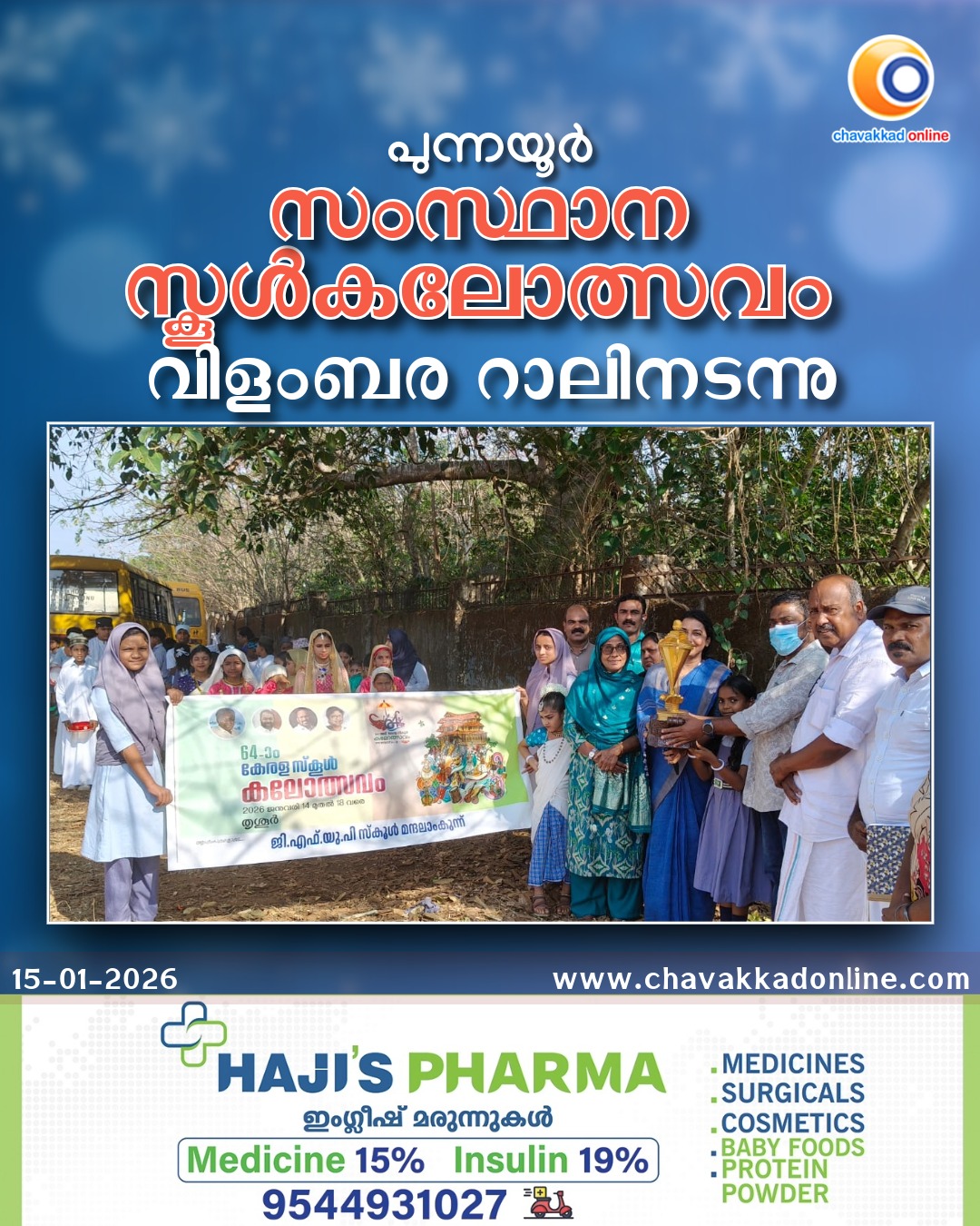 പുന്നയൂർ:- ഫെബ്രുവരി 14 മുതൽ 18 വരെ തൃശൂരിൽ നടക്കുന്ന സംസ്ഥാന സ്കൂൾ കലോത്സവത്തിന്റെ ഭാഗമായി മന്ദലാംകുന്ന് ജി.എഫ്.യു.പി സ്കൂളിന്റെ നേതൃത്വത്തിൽവിളംബര റാലി നടന്നു. കലോത്സവ സ്വർണ്ണ കപ്പിന്റെ മോഡലുമായാണ് റാലി നടന്നത്. റാലിയിൽ വിദ്യാർത്ഥികളുടെ മറ്റു കലാപ്രകടനങ്ങളും നടന്നു.