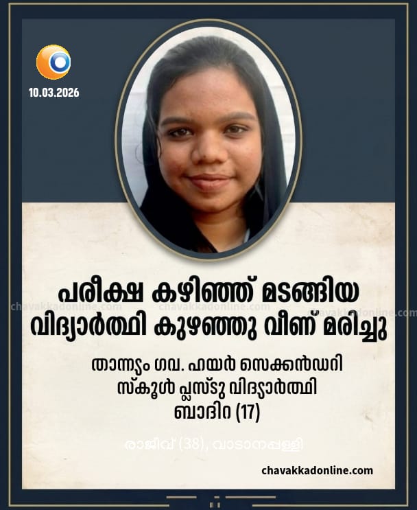 താന്ന്യം : പ്ലസ്ടു പരീക്ഷ കഴിഞ്ഞ് വീട്ടിലേക്ക് മടങ്ങിയ വിദ്യാർത്ഥിനി വഴിയിൽ കുഴഞ്ഞു വീണ് മരിച്ചു. അന്തിക്കാട് താന്ന്യം വലിയകത്ത് ബാദുഷയുടെ മകൾ ബാദിറ (17) യാണ് മരിച്ചത്. താന്ന്യം ഗവ. ഹയർ സെക്കൻഡറി സ്കൂളിലെ പ്ലസ്ടു വിദ്യാർത്ഥിനിയാണ്. രാവിലെ നടന്ന പരീക്ഷ കഴിഞ്ഞ് ഉച്ചയോടെ വീട്ടിലേക്ക് മടങ്ങിയ വിദ്യാർത്ഥിനി വീടിന് സമീപത്ത് വെച്ച് വഴിയിൽ കുഴഞ്ഞു വീഴുകയായിരുന്നു. ഉടൻ പഴുവിൽ മിഷൻ ആശുപത്രിയിൽ എത്തിച്ചെങ്കിലും ജീവൻ രക്ഷിക്കാനായില്ല.