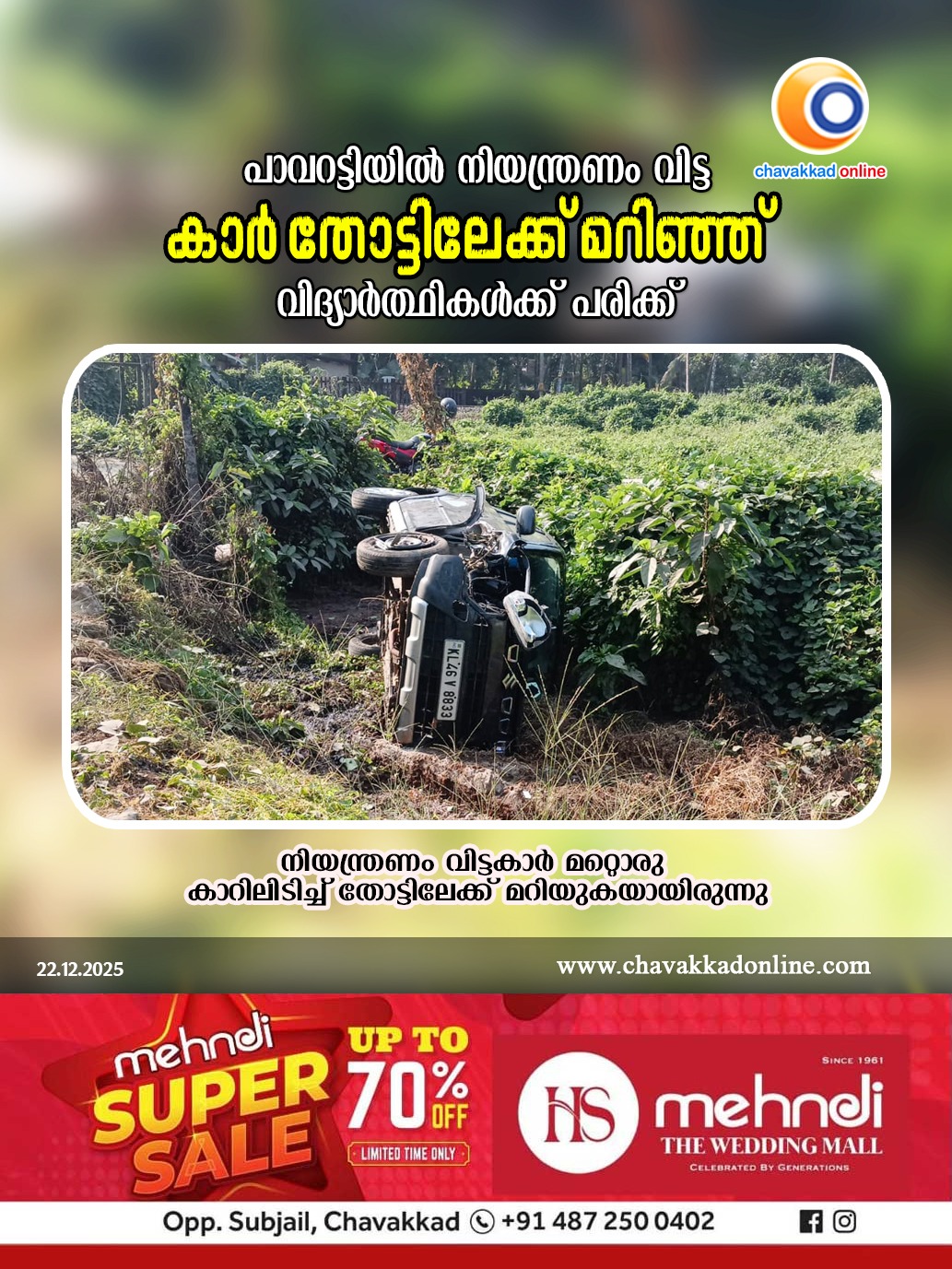 പാവറട്ടിയിൽ നിയന്ത്രണം വിട്ട കാർ തോട്ടിലേക്ക് മറിഞ്ഞ് വിദ്യാർത്ഥികൾക്ക് പരിക്ക്