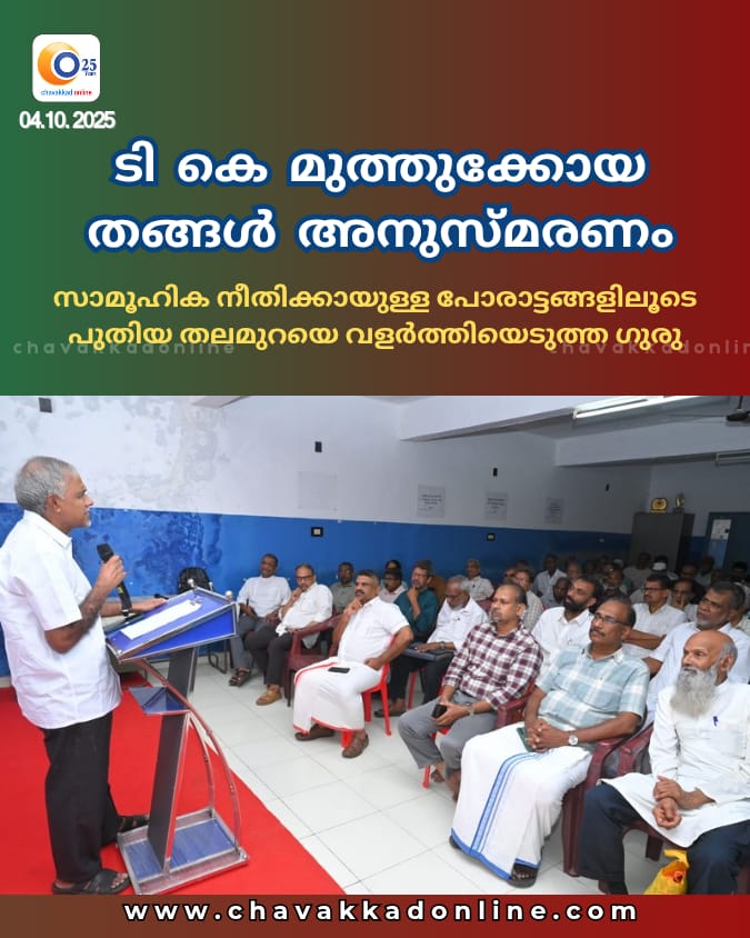 ചാവക്കാട്: ജീവിതകാലം മുഴുവൻ മനുഷ്യാവകാശങ്ങൾക്കും ദരിദ്രജനങ്ങളുടെ ശബ്ദത്തിനുമായി എഴുതുകയും പ്രവർത്തിക്കുകയും ചെയ്ത അധ്യാപകനും, കവിയും തത്ത്വചിന്തകനുമായിരുന്ന ടി കെ മുത്തുക്കോയ തങ്ങളെ അനുസ്മരിച്ചു. ചാവക്കാട് എം എസ് എസ് ഹാളിൽ അസർ സെന്ററിന്റെ ആഭിമുഖ്യത്തിൽ നടന്ന അനുസ്മരണ ചടങ്ങ് കുഞ്ഞുമുഹമ്മദ് പുലവത്ത് (മാനാസ് ഫൗണ്ടേഷൻ) ഉദ്ഘാടനം ചെയ്തു. സാമൂഹിക നീതിക്കായുള്ള പോരാട്ടങ്ങളിലൂടെ പുതിയ തലമുറയെ വളർത്തിയെടുത്ത ഗുരുവായി മുത്തുക്കോയ തങ്ങൾ എന്നും ഓർമ്മിക്കപ്പെടുമെന്ന് അദ്ദേഹം പറഞ്ഞു.