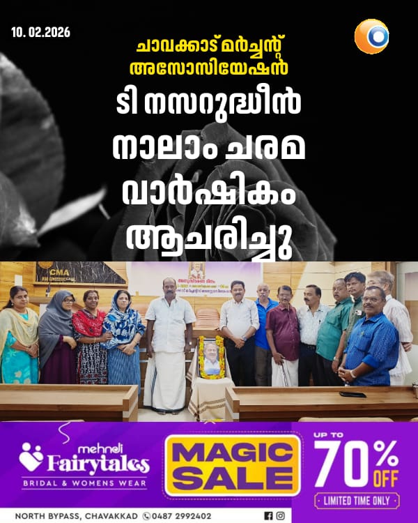 ചാവക്കാട്: കേരള വ്യാപാരി വ്യവസായി ഏകോപന സമിതി മുൻ സംസ്ഥാന പ്രസിഡണ്ടായിരുന്ന ടി നസറുദ്ധീന്റെ നാലാം ചരമ വാർഷികം ആചരിച്ചു. ചാവക്കാട് മർച്ചന്റ്സ് അസോസിയേഷൻ ചാവക്കാട് വ്യാപാര ഭവനിൽ വെച്ച് സംഘടിപ്പിച്ച അനുസ്മരണ യോഗം കെ.വി.വി.ഇ.എസ് ജില്ലാ സെക്രട്ടറിയേറ്റ് അംഗവും സിഎംഎ ജനറൽ സെക്രട്ടറിയുമായ ജോജി തോമസ് ഉദ്ഘാടനം ചെയ്തു. വൈസ് പ്രസിഡണ്ട് കെ എൻ സുധീർ അധ്യക്ഷത വഹിച്ചു.