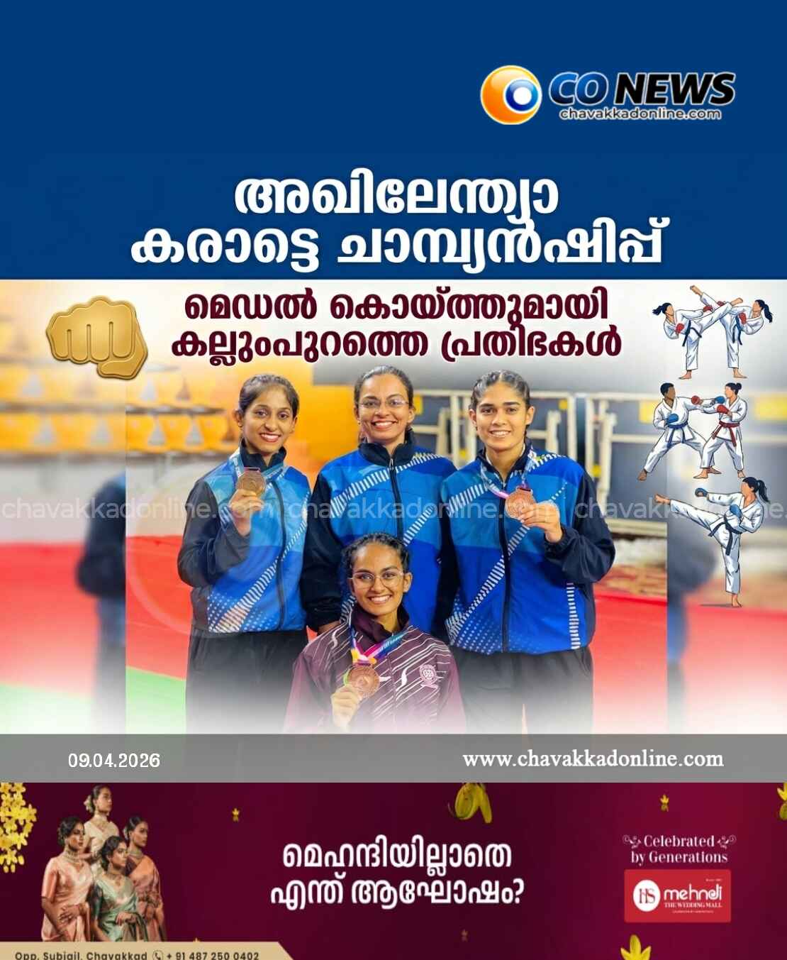 കുന്നംകുളം : അസ്സമിൽ നടന്ന അഖിലേന്ത്യാ അന്തർ സർവകലാശാല (All India Inter-University) കരാട്ടെ ചാമ്പ്യൻഷിപ്പിൽ വിജയക്കൊടി പാറിച്ചു കടവല്ലൂർ കല്ലുംപുറത്തെ കായികതാരങ്ങൾ. കഠിനാധ്വാനത്തിന്റെയും കണ്ണീരിന്റെയും വിലയുള്ള പോരാട്ടത്തിനൊടുവിൽ മൂന്ന് മെഡലുകളാണ് ഈ ഗ്രാമത്തിലേക്ക് എത്തിയത്.* സ്മൃതി (കാലിക്കറ്റ് യൂണിവേഴ്സിറ്റി): ടീം കത്ത വിഭാഗത്തിൽ സ്വർണ്ണ മെഡൽ.* സാനിയ (കാലിക്കറ്റ് യൂണിവേഴ്സിറ്റി): ടീം കുമിത്തെ വിഭാഗത്തിൽ വെങ്കല മെഡൽ.* ജന്നത്തുൽ ഷെറിൻ (എം.ജി യൂണിവേഴ്സിറ്റി): ടീം കത്ത വിഭാഗത്തിൽ വെങ്കല മെഡൽ.* ജിസ്മ: കാലിക്കറ്റ് യൂണിവേഴ്സിറ്റി വനിതാ ടീം കോച്ച് കഠിനാധ്വാനത്തിന്റെ വിജയംഒരു നാടിനെ മുഴുവൻ അഭിമാനത്തിലാഴ്ത്തിയ ഈ നേട്ടം ഏറെ പ്രയത്നങ്ങൾക്ക് ശേഷമാണ് കൈവരിച്ചത്. കാലിക്കറ്റ് സർവകലാശാലയ്ക്കായി സ്വർണ്ണമണിഞ്ഞ സ്മൃതി, താണ്ഡവളപ്പിൽ സുരേഷ്-സുമ ദമ്പതികളുടെ മകളാണ്. ടീം കുമിത്തെയിൽ വെങ്കലം നേടിയ സാനിയ, കണക്കോട്ടയിൽ നാസർ-മിസിരിയ ദമ്പതികളുടെ മകളാണ്.മഹാത്മാഗാന്ധി സർവകലാശാലയെ പ്രതിനിധീകരിച്ച് ടീം കത്തയിൽ വെങ്കലം നേടിയത് ജന്നത്തുൽ ഷെറിൻ ആണ്. ഇതേ ചാമ്പ്യൻഷിപ്പിൽ കാലിക്കറ്റ് സർവകലാശാല വനിതാ ടീമിന്റെ കോച്ചായി തിളങ്ങിയ ജിസ്മ, ജന്നത്തുൽ ഷെറിന്റെ സഹോദരിയാണ്. പുത്തൻപീടികയിൽ മൊയ്തുട്ടി-ആയിഷ ദമ്പതികളാണ് ഇവരുടെ മാതാപിതാക്കൾ