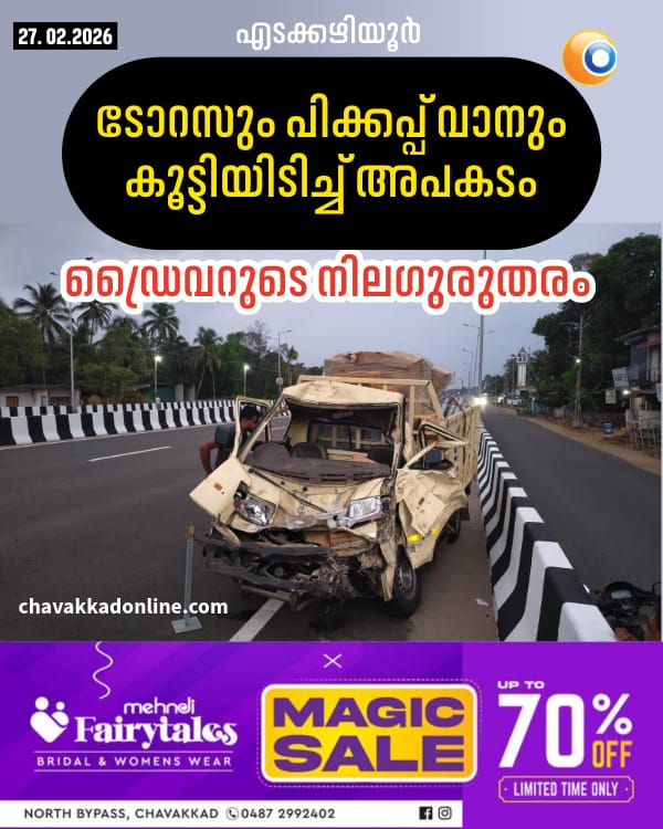 എടക്കഴിയൂരിൽ ടോറസും പിക്കപ്പ് വാനും കൂട്ടിയിടിച്ച് അപകടം; ഡ്രൈവറുടെ നിലഗുരുതരം