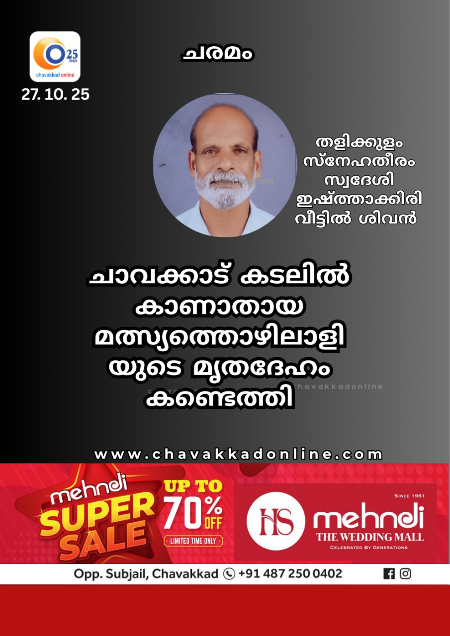 മത്സ്യബന്ധനത്തിനിടെ കടലിൽ കാണാതായ തൊഴിലാളിയുടെ മൃതദേഹം കണ്ടെത്തി