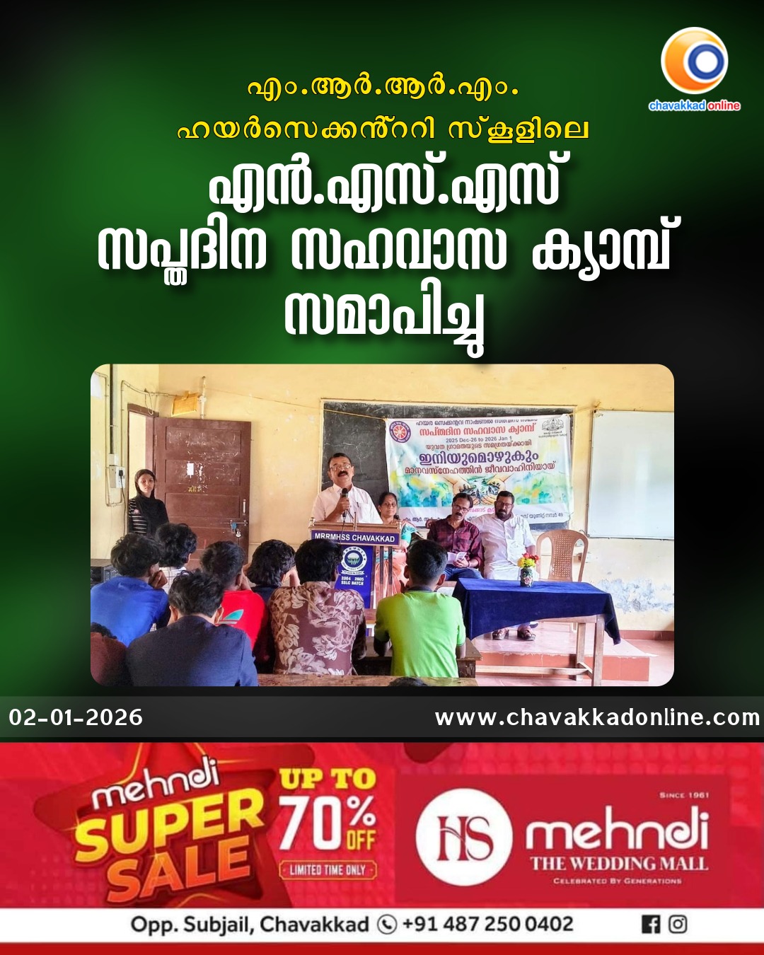 ചാവക്കാട്: എം.ആർ.ആർ.എം ഹയർസെക്കൻ്ററി സ്കൂളിലെ എൻ. എസ്.എസ് സപ്തദിന സഹവാസ ക്യാമ്പ് സമാപിച്ചു. ചാവക്കാട് നഗരസഭ വാർഡ് കൗൺസിലറായ പി. യതീന്ദ്രദാസ് ഉദ്ഘാടനം നിർവഹിച്ച ചടങ്ങിൽ പ്രിൻസിപ്പാൾ എം. ഡി. ഷീബ സ്വാഗതം പറഞ്ഞു.