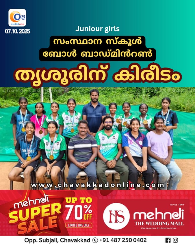 ചാവക്കാട് : സംസ്ഥാന സ്കൂൾ ബോൾ ബാഡ്മിന്റൺ ചാമ്പ്യൻഷിപ്പിൽ പെൺകുട്ടികളുടെ ജൂനിയർ വിഭാഗം മത്സരത്തിൽ തൃശ്ശൂർ ജില്ല വിജയകിരീടം ചൂടി. സെമിഫൈനൽ മത്സരത്തിൽ ശക്തരായ തിരുവനന്തപുരം ജില്ലയെ തോൽപ്പിച്ചാണ് തൃശ്ശൂർ ഫൈനലിൽ പ്രവേശിച്ചത്. തുടർന്ന് നടന്നഫൈനൽ മത്സരത്തിൽ കരുത്തരായ മലപ്പുറം ജില്ലയെ ഒന്നിനെതിരെ 2 സെറ്റുകൾ പരാജയപ്പെടുത്തി തൃശ്ശൂർ ജില്ലാ ടീം സംസ്ഥാന ചാമ്പ്യന്മാരായി.