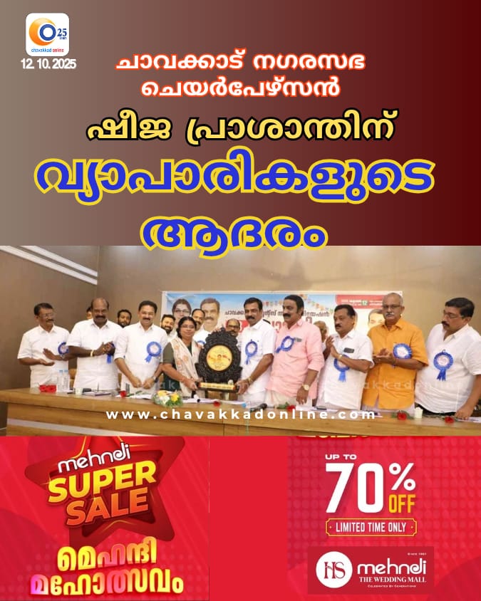 ചാവക്കാട് : ചാവക്കാട് നഗരസഭ ചെയർപേഴ്സൻ ഷീജ പ്രശാന്തിന് ചാവക്കാട് വ്യാപാരികളുടെ ആദരം. ചാവക്കാട് മർച്ചന്റ്സ് അസോസിയേഷന്റെ 68ാം വാർഷിക പൊതുയോഗത്തിലാണ് വ്യാപാരികളോടുള്ള സൗഹൃദ സമീപനം പരിഗണിച്ച് ഷീജ പ്രാശാന്തിനെ ആദരിച്ചത്. ജില്ലാ ജനറൽ സെക്രട്ടറി എൻ ആർ വിനോദ് കുമാർ യോഗം ഉദ്ഘാടനം ചെയ്തു. ചാവക്കാട് വ്യാപാരഭവനിൽ നടന്ന യോഗത്തിൽ കെ.വി.വി.ഇ.എസ് ജില്ലാ പ്രസിഡണ്ടും സി.എം.എ.പ്രസിഡന്റുമായ കെ വി അബ്ദുൽ ഹമീദ് അധ്യക്ഷത വഹിച്ചു. കെ വി വി ഇ എസ് ജില്ല ട്രഷറർ ജോയ് മുത്തേടൻ മുഖ്യപ്രഭാഷണം നടത്തി. സി എം എ ജനറൽ സെക്രട്ടറി ജോജി തോമസ് പ്രവർത്തനം റിപ്പോർട്ട് അവതരിപ്പിച്ചു. ട്രഷറർ കെ കെ സേതുമാധവൻ വരവ് ചിലവ് കണക്ക് അവതരിപ്പിച്ചു. വൈസ് പ്രസിഡണ്ട് കെ എൻ സുധീർ സ്വഗതം പറഞ്ഞു. മണ്ഡലം ചെയർമാൻ ലൂക്കോസ് തലക്കോട്ടൂർ, ജില്ലാ സെക്രട്ടറി എം കെ പോൾസൺ എന്നിവർ മുഖ്യഥിതികളായി.