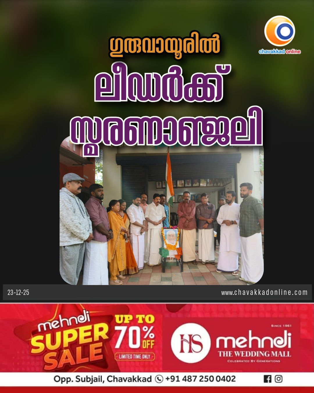 ഗുരുവായൂർ : ഗുരുവായൂരിൽ ലീഡർക്ക് സ്മരണാഞ്ജലി അർപ്പിച്ചു. ഗുരുവായൂരിനെ ലോക നെറുകെയിൽ എത്തിച്ച രാഷ്ട്രീയ രംഗത്തെ ഒരെയൊരു ലീഡറായിരുന്ന കെ. കരുണാകരന്റെ 15-ാം ചരമവാർഷിക ദിനത്തിൽ ഗുരുവായൂർ മണ്ഡലം കോൺഗ്രസ്സ് കമ്മറ്റിയുടെ ആഭിമുഖ്യത്തിൽ സ്മരണാജ്ഞലി അർപ്പിച്ച് അനുസ്മരിച്ചു. ഗുരുവായൂരിന്റെ ഇന്ന് കാണുന്ന സമസ്ത വികസനങ്ങൾക്കും, വികാസങ്ങൾക്കും ഗുരുവായൂർകാരനെ പോലെ മുന്നിൽ നിന്ന് നയിച്ച അതുല്യ കർമ്മയോഗിയായ കരുണാകരന്റെ നിസ്തുല പ്രവർത്തനഗാഥകളെകൂടി സ്മരിച്ച് ഗുരുവായൂർ മണ്ഡലം കമ്മിറ്റി ഓഫീസിൽ മണ്ഡലംപ്രസിഡണ്ട് ഒ. കെ. ആർ. മണികണ്ഠന്റെ അദ്ധ്യക്ഷതയിൽ ചേർന്ന സ്മരണ സദസ്സ് മുൻ ബ്ലോക്ക് കോൺഗ്രസ്സ് പ്രസിഡണ്ട് ആർ രവികുമാർ ഉദ്ഘാടനം ചെയ്തു. ബ്ലോക്ക് വൈസ് പ്രസിഡണ്ട് ബാലൻ വാറണാട്ട് ആമുഖ പ്രസംഗം നടത്തി. നഗരസഭ കൗൺസിലർമാരായ വി. എസ്. നവനീത്, പ്രിയാ രാജേന്ദ്രൻ, സുക്ഷ ബാബു, ബിന്ദു നാരായണൻ, യൂത്ത് കോൺഗ്രസ്സ് സംസ്ഥാന സെക്രട്ടറി സി. എസ് സൂരജ്, ബ്ലോക്ക് കോൺഗ്രസ്സ് സെക്രട്ടറിമാരായ സി. ജെ. റെയ്മണ്ട് മാസ്റ്റർ, ശിവൻ പാലിയത്ത്, മണ്ഡലം ഭാരവാഹികളായ ശശി വല്ലാശ്ശേരി, എ. കെ. ഷൈമിൽ, ശശി പട്ടത്താക്കിൽ, ഫിറോസ് പുത്തംമ്പല്ലി, ഒ. പി. ജോൺസൺ, ആരിഫ് മാണിക്കത്ത്പടി എന്നിവർ പ്രസംഗിച്ചു. നേരത്തെ അലങ്കരിച്ച്വെച്ച ലീഡറുടെ ഛായാചിത്രത്തിൽ പുഷ്പാർച്ചനനടത്തി സമൂഹ പ്രാർത്ഥനയോടെയാണ് അനുസ്മരണചടങ്ങിന് തുടക്കം കുറിച്ചത്