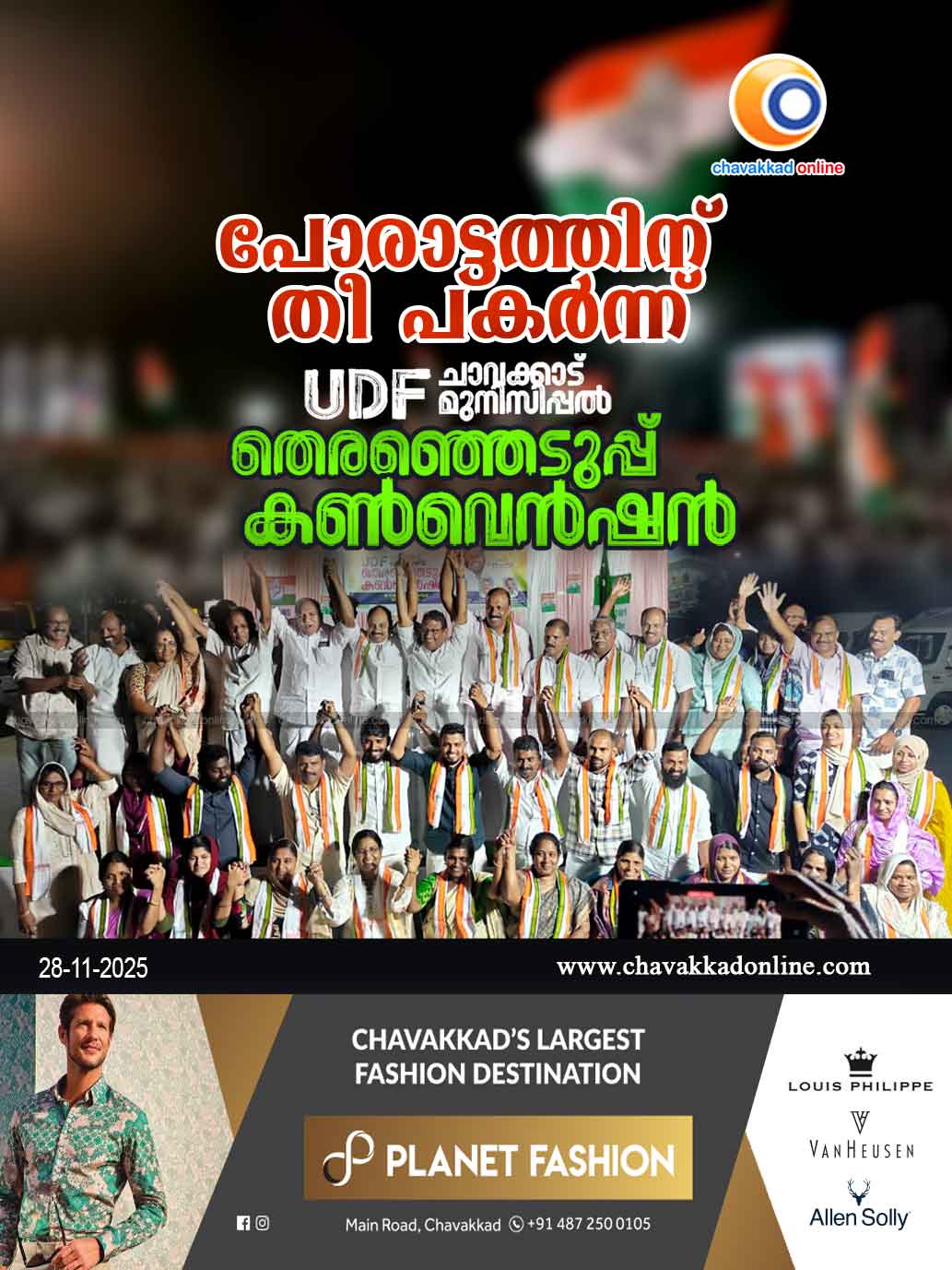ചാവക്കാട്: ചാവക്കാട് നഗരസഭ യു ഡി എഫ് കമ്മിറ്റിയുടെ നേതൃത്വത്തിൽ തിരഞ്ഞെടുപ്പ് കൺവെൻഷൻ സംഘടിപ്പിച്ചു. ചാവക്കാട് കൂട്ടുങ്ങൽ ചത്വരത്തിൽ നടന്ന കൺവെൻഷൻ ടി എൻ പ്രതാപൻ ഉദ്ഘാടനം ചെയ്തു. കേരള കോണ്ഗ്രസ് ജില്ലാ പ്രസിഡന്റ് സി വി കുര്യാക്കോസ് മുഖ്യ പ്രഭാഷണം നിർവഹിച്ചു. ചാവക്കാട് നഗരസഭയിലെ 33 യു ഡി എഫ്സ്ഥാ നാർഥികളും നേതാക്കൾക്കൊപ്പം വേദിയിൽ അണിനിരന്നതോടെ സദസ്സിൽ ആരവമുയർന്നു.