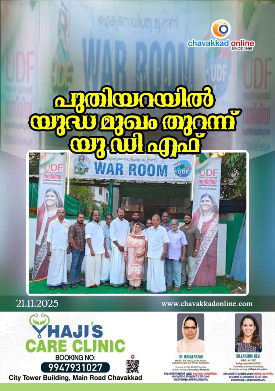 ചാവക്കാട് : പുതിയറയിൽ പോർമുഖം തുറന്ന് യു ഡി എഫ്. ചാവക്കാട് നഗരസഭ വാർഡ് 30 ലാണ് യു ഡി എഫ് വാർ റൂം തുറന്നത്. യു ഡി എഫ് ന്റെ സ്വതന്ത്ര സ്ഥാനാർത്ഥി നസ്രിയ കുഞ്ഞു മുഹമ്മദിന്റെ തിരഞ്ഞെടുപ്പ് കമ്മിറ്റി ഓഫീസിനാണ് വാർ റൂം എന്ന് പേര് നൽകിയിരിക്കുന്നത്. ഇന്നലെ വ്യാഴാഴ്ചയാണ് കോണ്ഗ്രസ് നേതാവ് കെ നവാസ് ഓഫീസ് ഉദ്ഘാടനം ചെയ്തത്. 2010 വരെയും മുസ്ലിം ലീഗ് സ്ഥാനാർഥി തുടർച്ചയായി ജയിച്ചുവന്ന യു ഡി എഫി ന്റെ സീറ്റായിരുന്നു വാർഡ് 32.