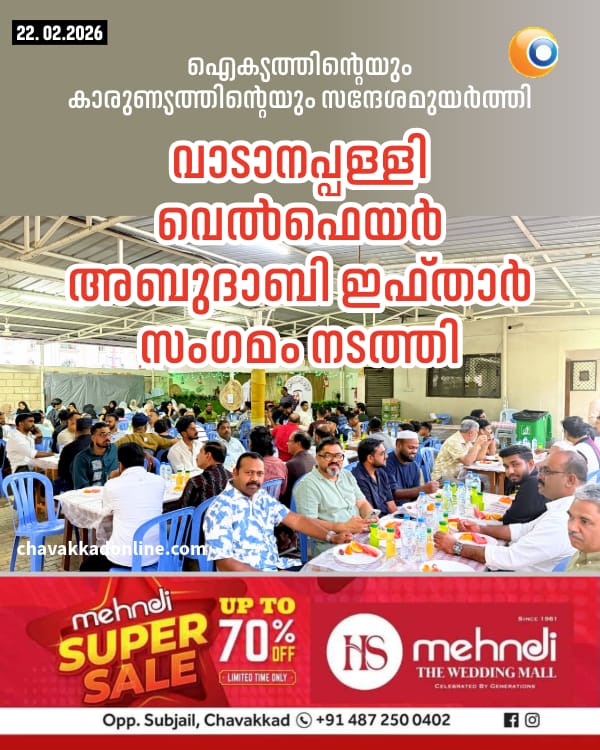 അബുദാബി: വാടാനപ്പള്ളി വെൽഫെയർ അബുദാബി (വേവ്) സംഘടിപ്പിച്ച ഇഫ്താർ സംഗമം അബുദാബിയിലെ ഇന്ത്യന് സോഷ്യല് കള്ച്ചറല് സെന്റര് (ഐ.സി.സി.)യിൽ വെച്ച് നടന്നു. വാടാനപ്പള്ളിയിൽ നിന്നുള്ള 200-ൽ അധികം പേർ ഇഫ്താർ മീറ്റിൽ പങ്കെടുത്തു.