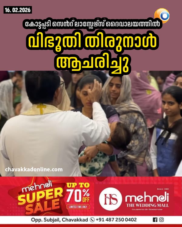 കോട്ടപ്പടി : സെൻറ് ലാസ്സേഴ്സ് ദൈവാലയത്തിൽ വിഭൂതി തിരുനാൾ ആചരിച്ചു. അൻപത് നോമ്പിൻറെ ആരംഭ ദിനമായ തിങ്കളാഴ്ചയാണ് വിഭൂതി തിരുനാൾ ആചരിക്കുന്നത്. രാവിലെ ആറിന് നടന്ന വിഭൂതി തിരു കർമ്മങ്ങൾക്കും വിശുദ്ധ കുർബാനയ്ക്കും അസിസ്റ്റൻറ് വികാരി റവ. ഫാ. വിബി പൊറുത്തുകാരൻ കാർമികത്വം വഹിച്ചു. മനുഷ്യ നീ പൊടിയാകുന്നു പൊടിയിലേക്ക് തന്നെ മടങ്ങും എന്ന ധ്യാന ചിന്തയിൽ എല്ലാ വിശ്വാസികളും നെറ്റിയിൽ ചാരം പൂശി അമ്പതു നോമ്പിന്റെ ചൈതന്യത്തിലേക്ക് പ്രവേശിച്ചു.