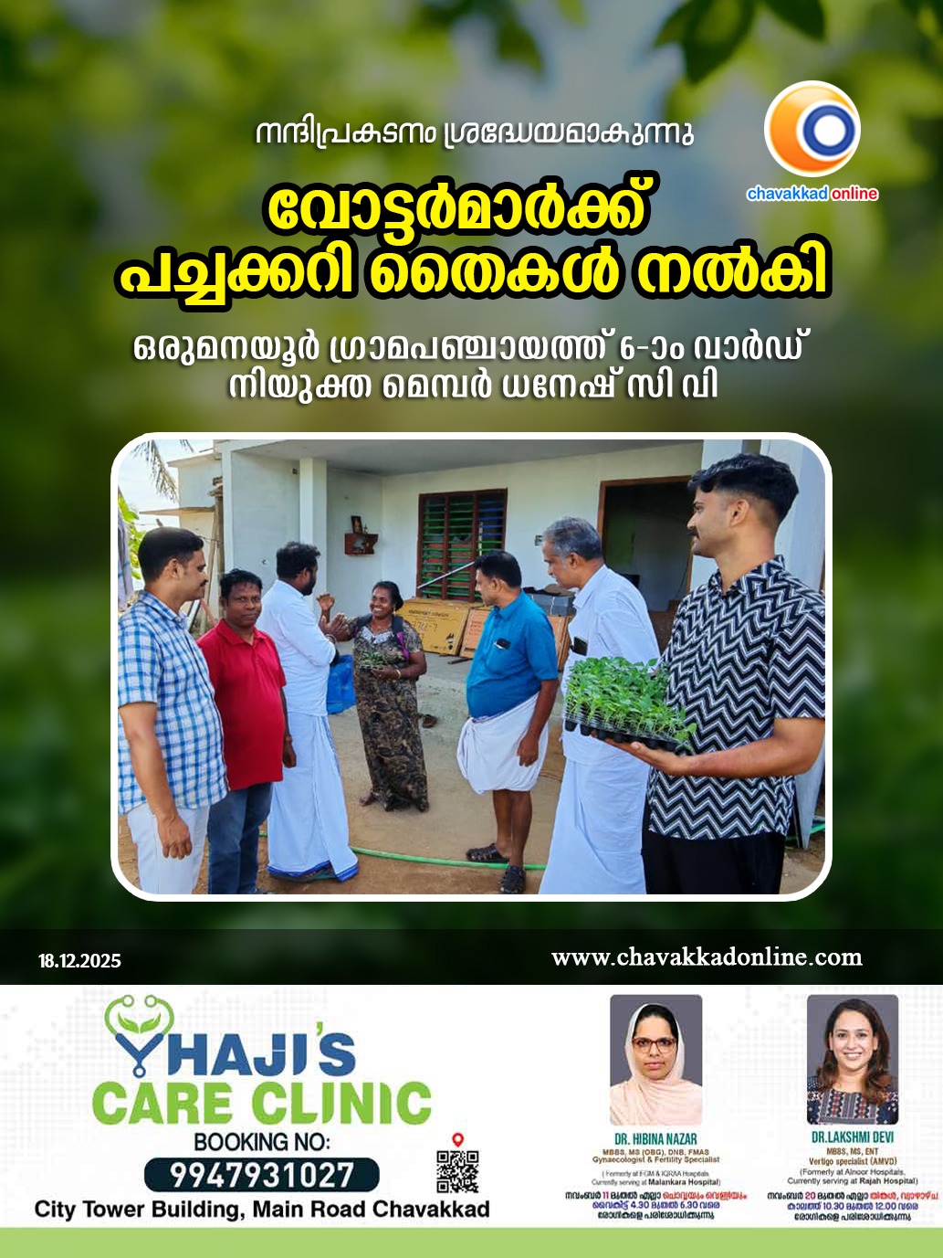ഒരുമനയൂർ: ഒരുമനയൂർ ഗ്രാമപഞ്ചായത്ത് 6-ാം വാർഡിലെ നിയുക്ത മെമ്പറായി തിരഞ്ഞെടുക്കപ്പെട്ട ധനേഷ് സി വി തന്റെ വിജയാഹ്ലാദം പങ്കുവെച്ച് വാർഡിലെ ജനങ്ങൾക്ക് നന്ദി അറിയിക്കുന്നതിനായി നേരിട്ട് വീടുകളിലെത്തി. പച്ചക്കറി തൈകൾ വിതരണം ചെയ്തുകൊണ്ടാണ് അദ്ദേഹം നന്ദി അറിയിച്ചത്. ജനകീയവും പരിസ്ഥിതി സൗഹൃദവുമായ ഈ പ്രവർത്തനം നാട്ടുകാർക്ക് മാതൃകയായി.