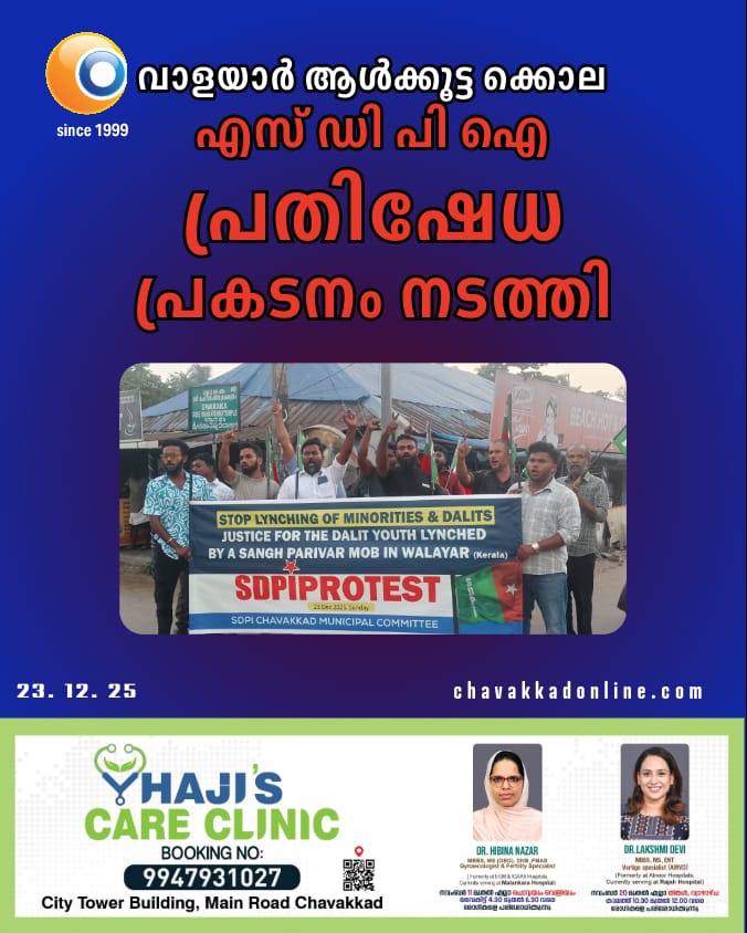 ചാവക്കാട് : പാലക്കാട് വാളയാറിൽ ദലിത് യുവാവിനെ സംഘപരിവാർ ആൾക്കൂട്ടം തല്ലിക്കൊന്നതിൽ പ്രതിഷേധിച്ച് എസ് ഡി പി ഐ ചാക്കാട് മുൻസിപ്പൽ കമ്മിറ്റിയുടെ നേതൃത്വത്തിൽ ചാവക്കാട് ബീച്ചിൽ പ്രതിഷേധ പ്രകടനം നടത്തി.
