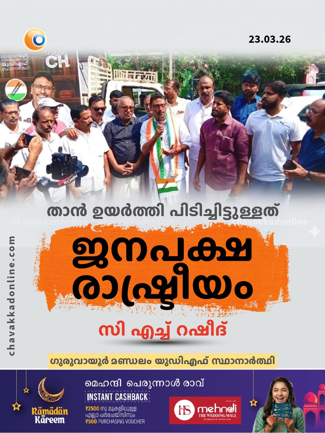 ഗുരുവായൂർ : ക്ഷേത്ര നഗരിയിലെ എല്ലാ വികസനവും ഈ നാട് ഒരുമിച്ച് നേടിയെടുത്താണ്. അമൃത് പദ്ധതിയിലും മറ്റു വികസന പ്രവർത്തനങ്ങളിലും ഒരു പൊതു പ്രവർത്തകൻ എന്ന നിലയിൽ വലിയ പങ്ക് വഹിച്ച ഒരാളാണ് ഞാൻ. ഗുരുവായൂർ മുൻസിപ്പാലിറ്റി രൂപീകരിക്കുന്നതിൽ എന്റെ പങ്ക് എന്താണെന്ന് ഗുരുവായൂരിലെ ജനപ്രതിനിധികൾക്കും പൊതു പ്രവർത്തകർക്കും അറിയാം. എല്ലാ തലപര്യങ്ങൾക്കും അപ്പുറം ജനപക്ഷ രാഷ്ട്രീയമാണ് താൻ ഉയർത്തി പിടിച്ചിട്ടുള്ളതെന്നും സി.ച്ച് റഷീദ്. ഗുരുവായൂർ മണ്ഡലം റോഡ് ഷോക്ക് ഗുരുവായൂർ മഞ്ജുലാൽ പരിസരത്ത് തുടക്കം കുറിച്ച് വോട്ടർമാരെ അഭിവാദ്യം ചെയ്യുകയിരുന്നു റഷീദ്. ഗുരുവായൂർ മതേതര മണ്ണാണ്. ക്ഷേത്ര നഗരിയുടെ പവിത്രത ഓരോ വിശ്വാസിയും കാത്ത് സൂക്ഷിക്കുന്ന നാടാണ്. ഈ മണ്ണിൽ വിഷം കലർത്താൻ വന്നവരെ എന്നും ആട്ടിയോടിച്ച പാരമ്പര്യമാണ് ഈ നാടിനുള്ളത്. എവിടെ നിന്നോ നാല് വോട്ടിന് വേണ്ടി വർഗീയത പറഞ്ഞു ഭിന്നിപ്പിക്കാം എന്ന് കരുതിയവർക്ക് ഈ നാടിനെ കുറിച്ചറിയാത്തത് കൊണ്ടാണെന്നും സി.എച്ച് റഷീദ് പറഞ്ഞു. മതം പറഞ്ഞു വോട്ട് പിടിക്കാൻ വരുന്നവർ ഈ മണ്ഡലത്തിന്റെ സംസ്കാരവും വിശുദ്ധിയും അറിയാത്തവരാണ്. യു ഡി എഫ് സ്ഥാനാർഥി സി.എച്ച് റഷീദിന്റെ റോഡ് ഷോ ഗുരുവായൂർ കിഴക്കെ നടയിൽ ലീഗ് ജില്ല പ്രസിഡന്റ് സി.എ മുഹമ്മദ് റഷീദ് ഉദ്ഘാടനം ചെയ്തു. അരവിന്ദൻ പല്ലത്ത് അധ്യക്ഷത വഹിച്ചു.റോഡ് ഷോ മമ്മിയുർ വഴി വടക്കേകാട്, പുന്നയൂർകുളം, ചാവക്കാട്, ഒരുമനയൂർ എങ്ങണ്ടിയുർ,കടപ്പുറം ബ്ലാങ്ങാട് വഴി രാത്രി 8 മണിക്ക് മന്നലാംകുന്നിൽ സമാപിച്ചു. നൂറു കണക്കിന് ഇരുചക്ര വാഹനങ്ങളുടെ അകമ്പടിയോടെ ആരംഭിച്ച റോഡ് ഷോയിൽ സ്ഥാനാർഥി തുറന്ന വാഹനത്തിൽ വോട്ടർമാരെ അഭിവാദ്യം ചെയ്തു.സി.എ ഗോപ പ്രതാപൻ, ഉമ്മർ മുക്കണ്ടത്ത്, കെ.കെ ഹംസക്കുട്ടി, ആർ.വി അബ്ദുൽ റഹീം, സി.എസ് സൂരജ്, ആന്റോ തോമസ്, ഷാനവാസ് തിരുവത്ര, ആർ രവികുമാർ, ബഷീർ പൂക്കോട്, ആർ.വി ജലീൽ, ആർ. വി നവനീത്, നൗഷാദ് അഹമ്മു, കെ.പി ഉദയൻ, നിഖിൽ ജി കൃഷ്ണൻ എന്നിവർ പങ്കെടുത്തു