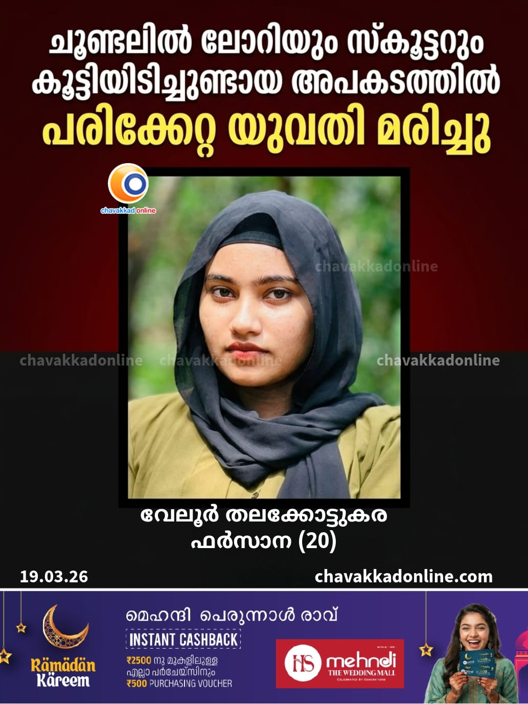 ചൂണ്ടലിൽ ലോറിയും സ്കൂട്ടറും കൂട്ടിയിടിച്ചുണ്ടായ അപകടത്തിൽ പരിക്കേറ്റ യുവതി മരിച്ചു
