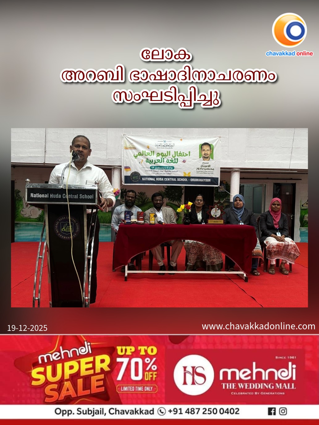 ഒരുമനയൂർ: നാഷണൽ ഹുദ സെൻട്രൽ സ്കൂൾ അറബി ഭാഷാദിനാചരണത്തിന്റെ ഭാഗമായി ലോക അറബി ഭാഷാ ദിനാചരണം 2025 വിവിധ പരിപാടികളോടെ ആഘോഷിച്ചു. ഡിസംബർ 19 ന് സ്കൂളിൽ നടന്ന പരിപാടിയിൽ അധ്യാപകരും വിദ്യാർത്ഥികളും സജീവമായി പങ്കെടുത്തു. സ്കൂളിലെ അറബിക് ഡിപ്പാർട്ട്മെന്റ് അധ്യാപകരും, വിദ്യാർത്ഥികളായ അഹമ്മദ് ഷഹീൻ എൻ.എം., യാസീൻ റഷീദ് എന്നിവർ പരിപാടിക്ക് നേതൃത്വം നൽകി. ആറാം ക്ലാസ് വിദ്യാർത്ഥി ഫിദാ ജാസ്മിന്റെ പ്രാർത്ഥനയോടെ പരിപാടികൾക്ക് തുടക്കം കുറിച്ചു.