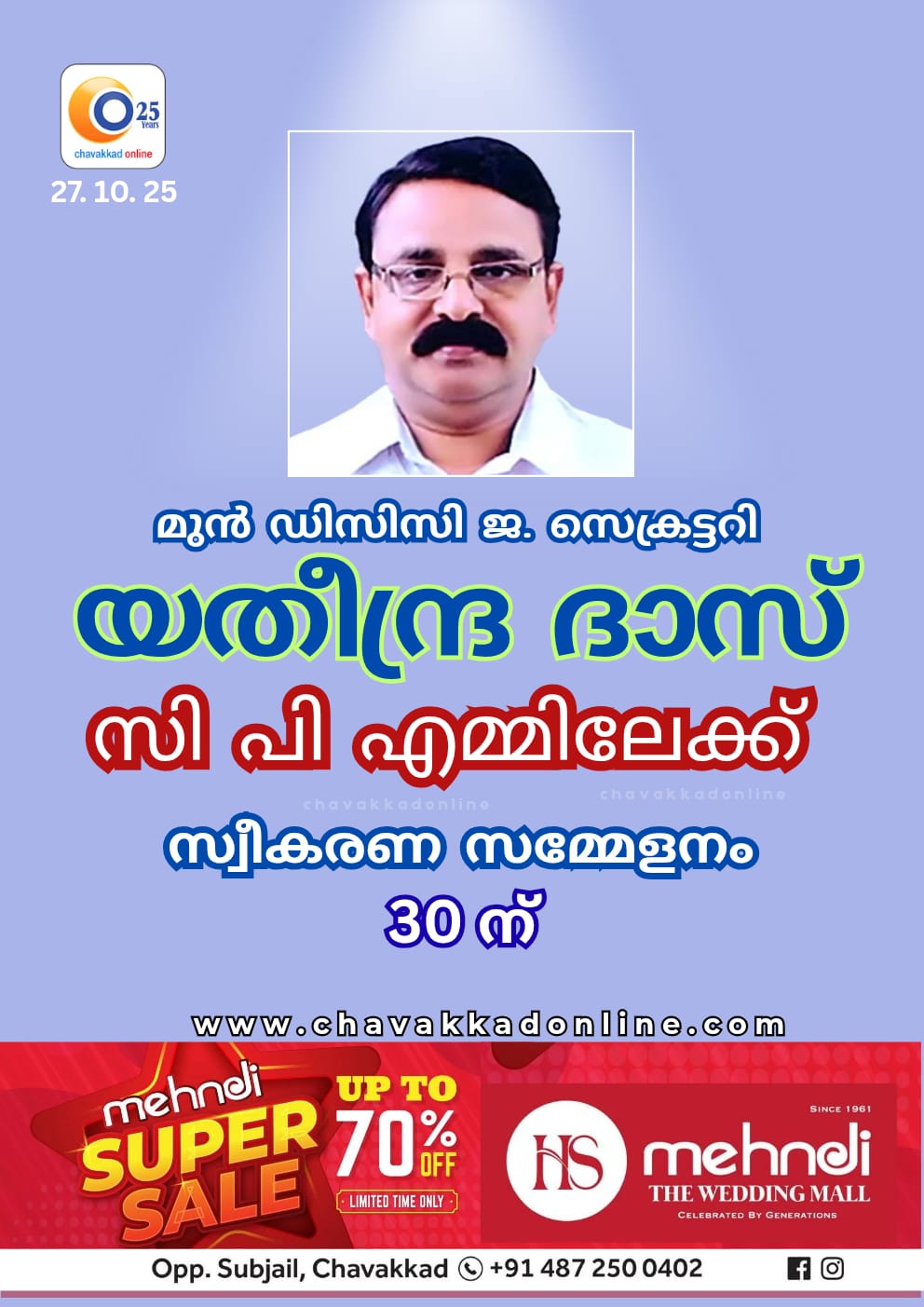 യതീന്ദ്ര ദാസ് സി പി എം ലേക്ക് – സ്വീകരണ സമ്മേളനം 30 ന്