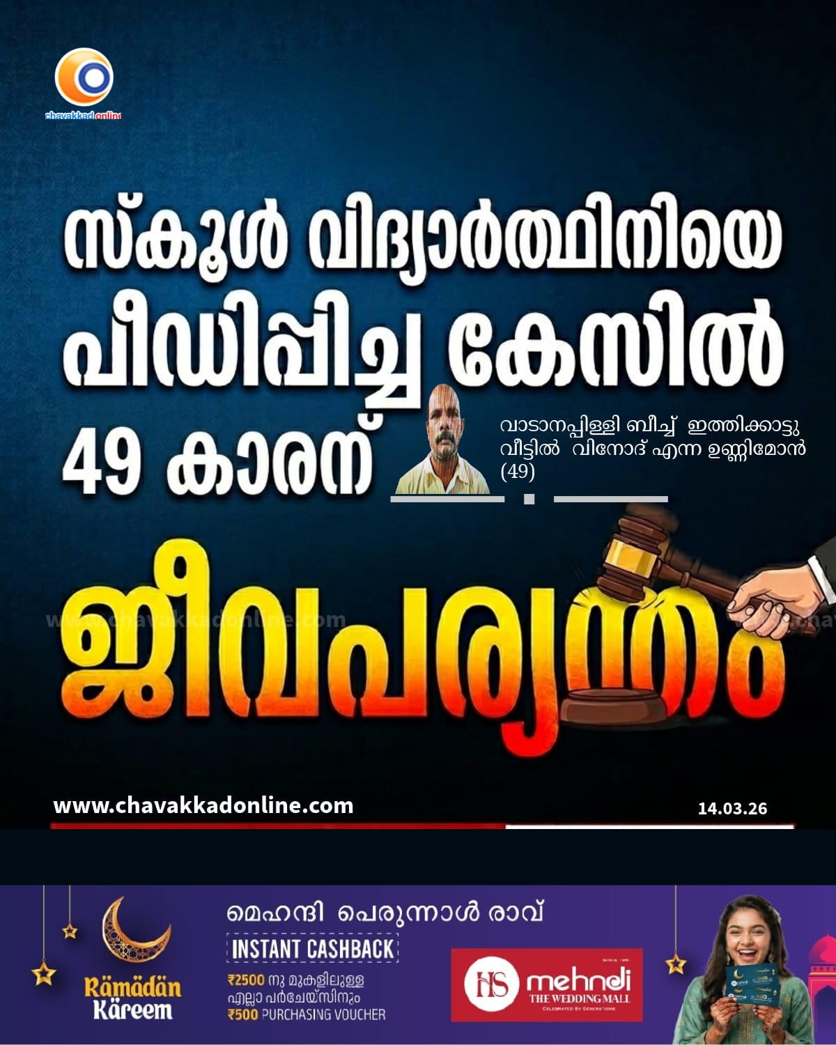 ചാവക്കാട്: പ്രായപൂർത്തിയാകാത്ത പെൺകുട്ടിയെ പലതവണ ലൈംഗി പീഡനം നടത്തിയ 49 വയസ്സുകാരനെ ജീവിതാവസാനം വരെ ജീവപര്യന്തം കഠിനതടവിനും 60,000/- രൂപ പിഴയും വിധിച്ചു. വാടാനപ്പിള്ളി ബീച്ച് ഇത്തിക്കാട്ടു വീട്ടിൽ വിനോദ് എന്ന ഉണ്ണിമോൻ (49)നെയാണ് ചാവക്കാട് ഫാസ്റ്റ് ട്രാക്ക് സ്പെഷ്യൽ കോടതി ശിക്ഷ വിധിച്ചത്. 2019 വർഷത്തിൽ സ്കൂൾ വെക്കേഷൻ സമയത്ത് ആണ് കേസ്സിനാ സ്പദമായ സംഭവം നടന്നത്. പിഴ അടക്കാത്ത പക്ഷം 6 മാസം കൂടി അധിക തടവ് അനുഭവിക്കണം. പ്രതിയെ മറ്റൊരു പോക്സോ കേസ്സിൽ കുന്ദംകുളം ഫാസ്റ്റ് ട്രാക്ക് കോടതി 73 വർഷം കഠിന തടവിനു വിധിക്കുകയും ശിക്ഷ അനുഭവിച്ചു കൊണ്ടിരിക്കുകയുമാണ്. പ്രോസിക്യൂഷനു വേണ്ടി സ്പെഷ്യൽ പബ്ലിക് പ്രോസിക്യൂട്ടർ അഡ്വ. സിജു മുട്ടത്ത്, അഡ്വ. സി.നിഷ എന്നിവർ ഹാജരായി. വിസ്താരവേളയിൽ ലെയ്സൺ ഓഫീസർ എം ആർ സിന്ധു കോടതിയിൽ പ്രോസിക്യൂഷൻ നടപടികൾ ഏകോപി പ്പിച്ചു.